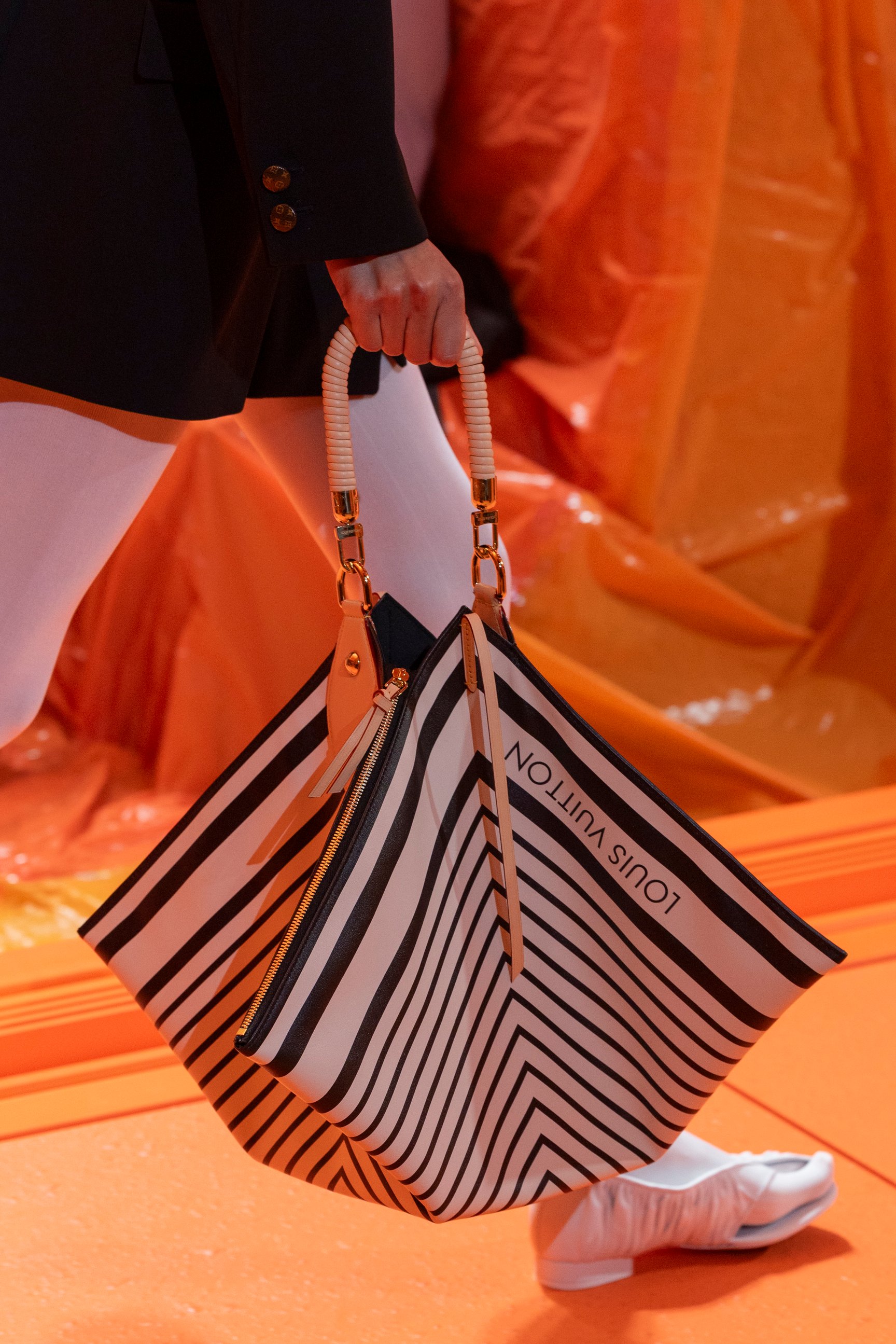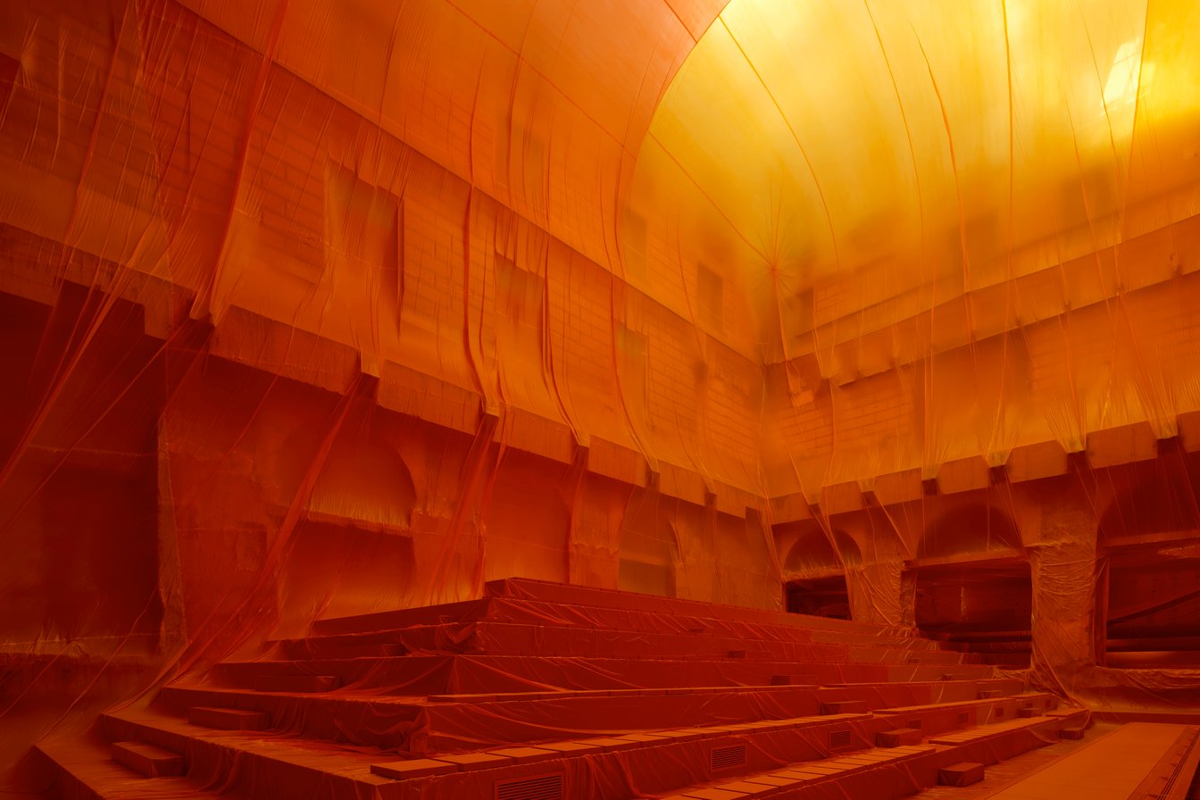 オレンジの工事用シートで会場全体を覆う大胆な舞台美術は、プロダクション兼デザイナー ジェームズ・チンランド(James Chinlund)との3度目となるコラボレーションで実現したもの。今回はスペインのプロダクション兼エージェンシー「ペニーク(Penique)」と共同で構想し、熱気球の内部のような臨場感あふれる世界観を作り上げた。