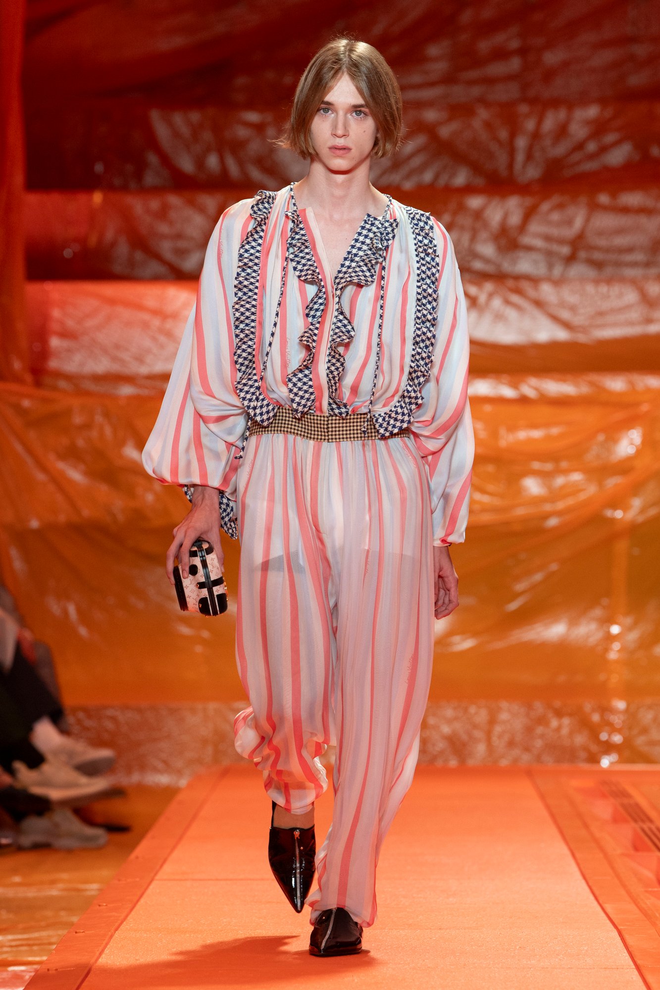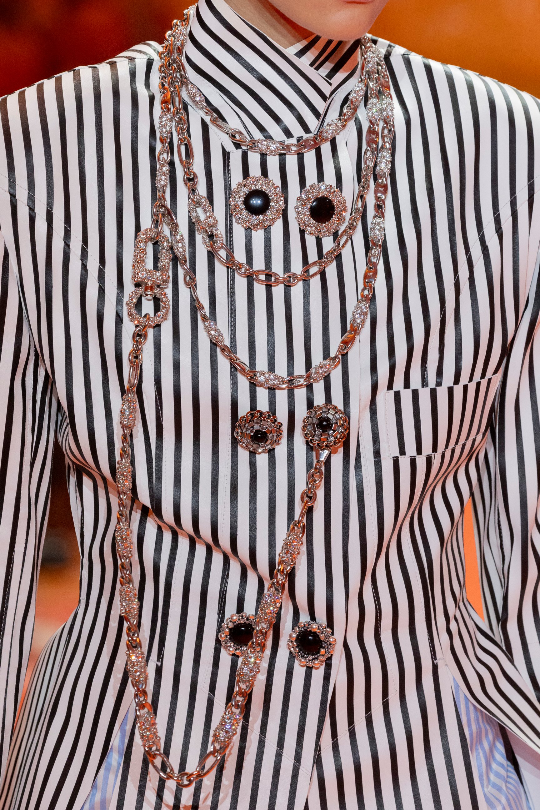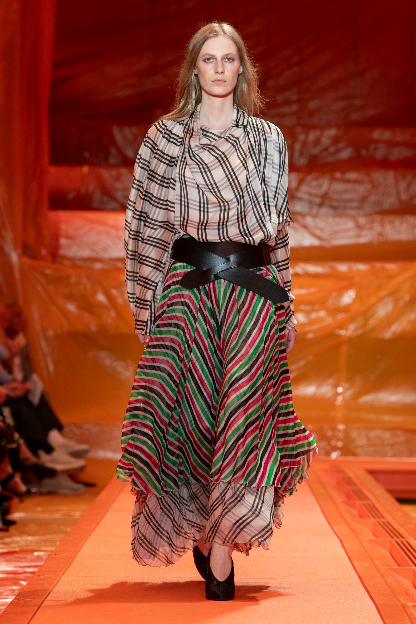 明確なコレクションテーマは公開されていないが、相反する要素をミックスしたスタイルは、2ルック目以降もバリエーション豊かに展開。フルイドな素材のスカートやブラウスに、ワイドベルトやレザーのボディスといった構築的なアイテムを組み合わせる。チェックやストライプも多用され、サーカス風のハイウエストパンツなどもユニークな装いを完成させた。チェック柄をビーズ刺繍で表現したり、細かいピースをつなげて千鳥格子を作り上げたりと、クチュール的な手仕事も取り入れられている。