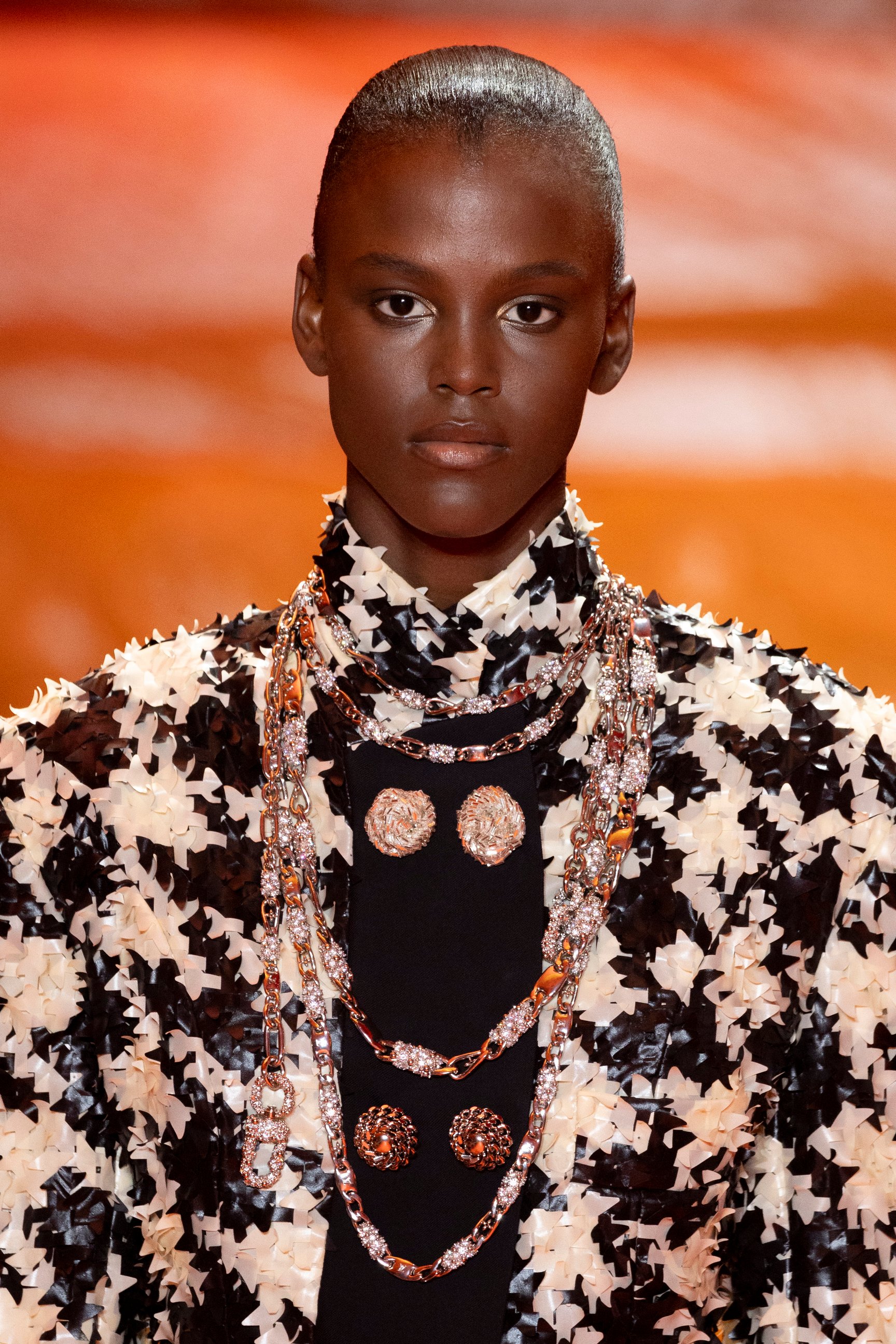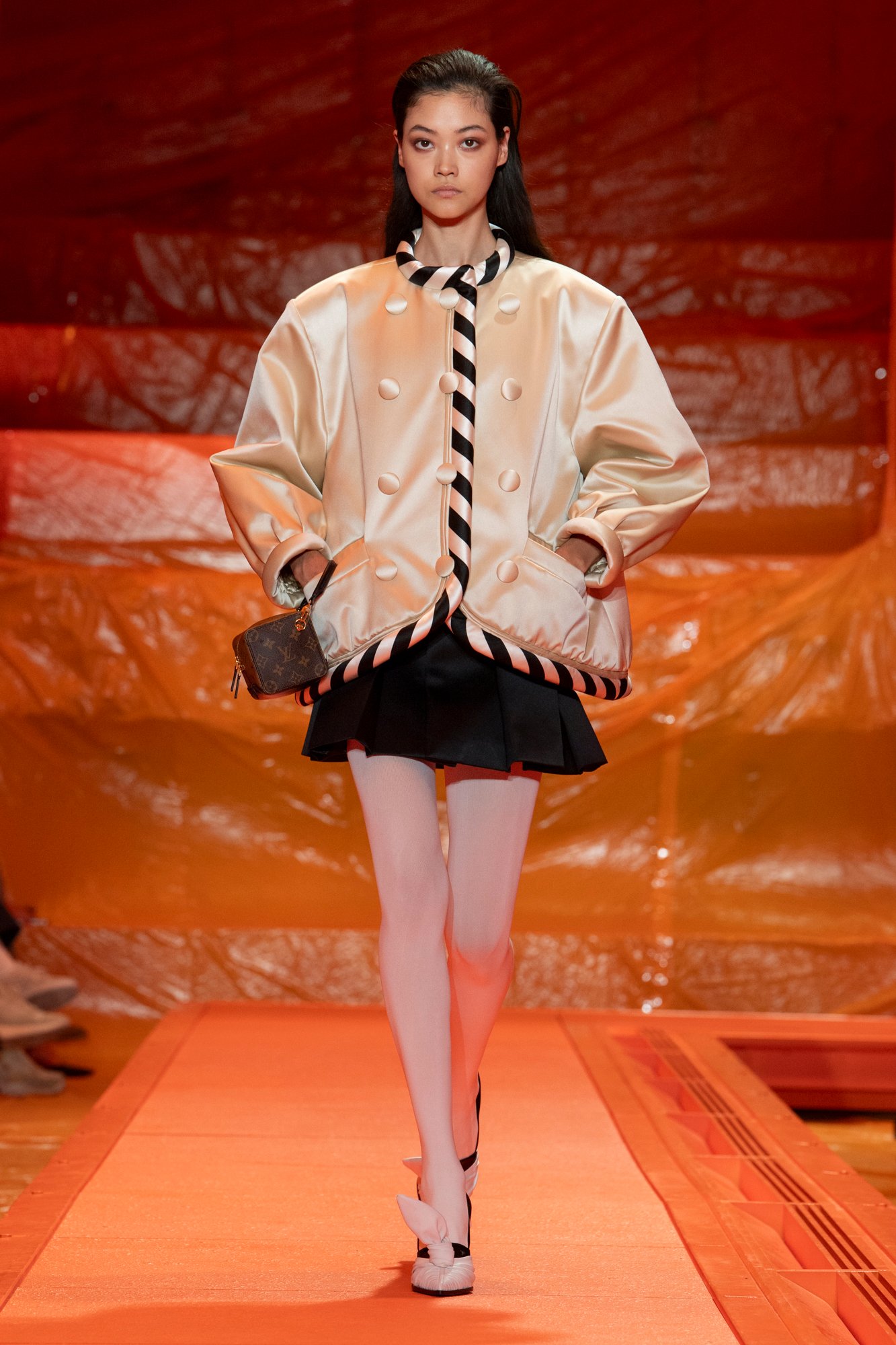 フランスの若きシンガーソングライター、ザホ・デ・サガザン(Zaho de Sagazan)の歌声が響き渡る中、ファーストルックで登場したのはブルゾンとフレアスカート。スポーティさとフェミニンさを併存させた、意外性のあるスタイルに仕上がった。