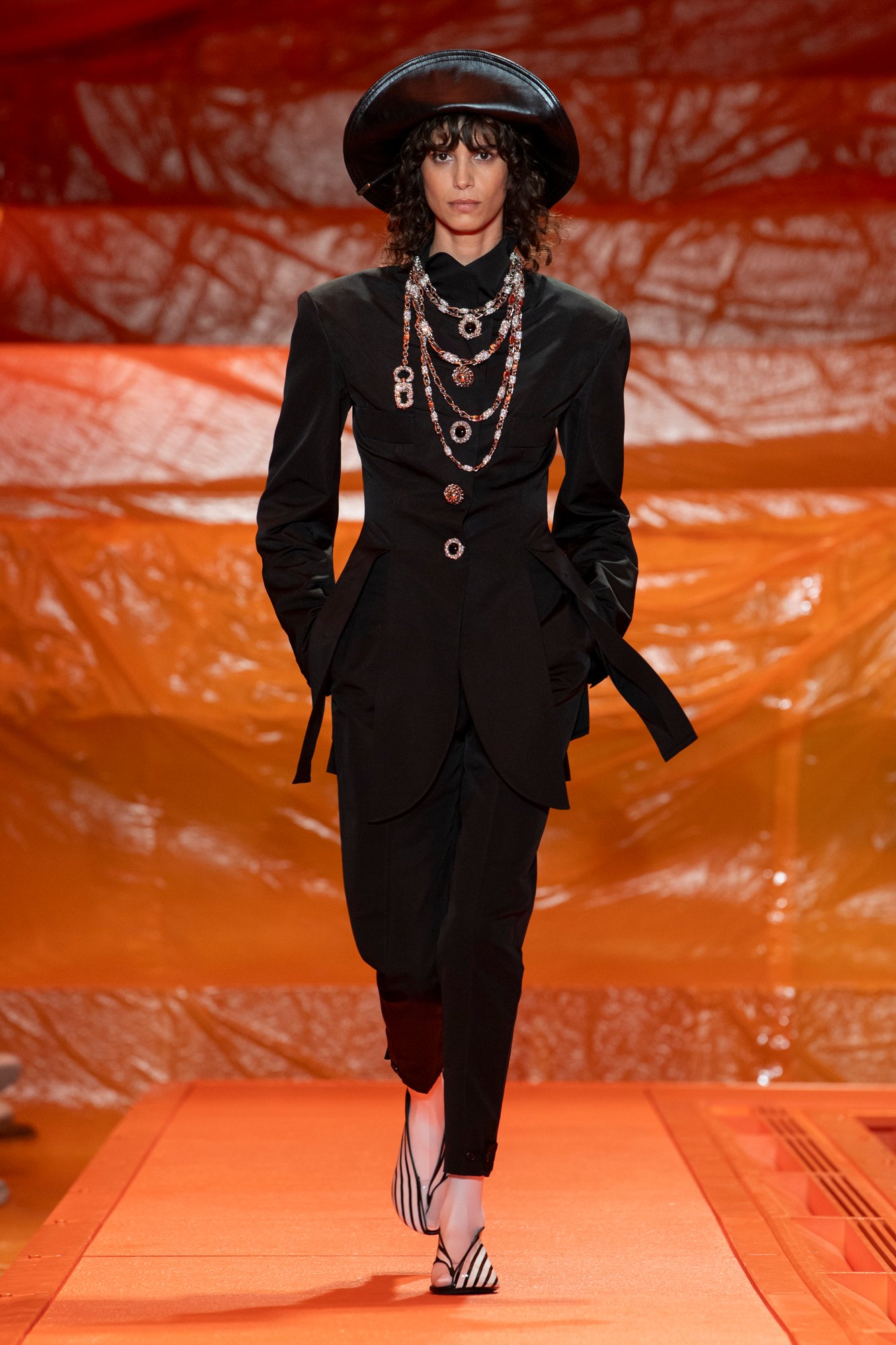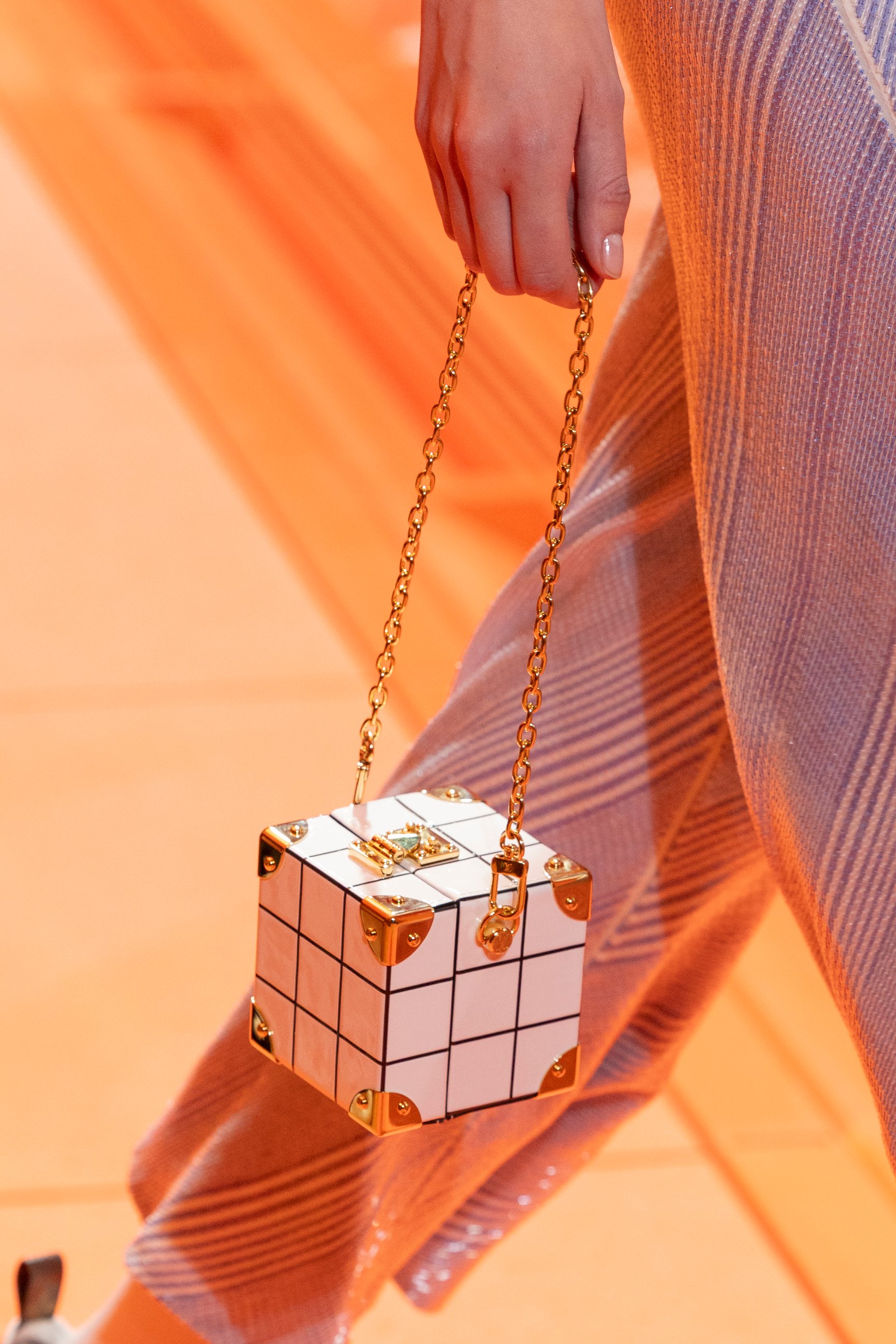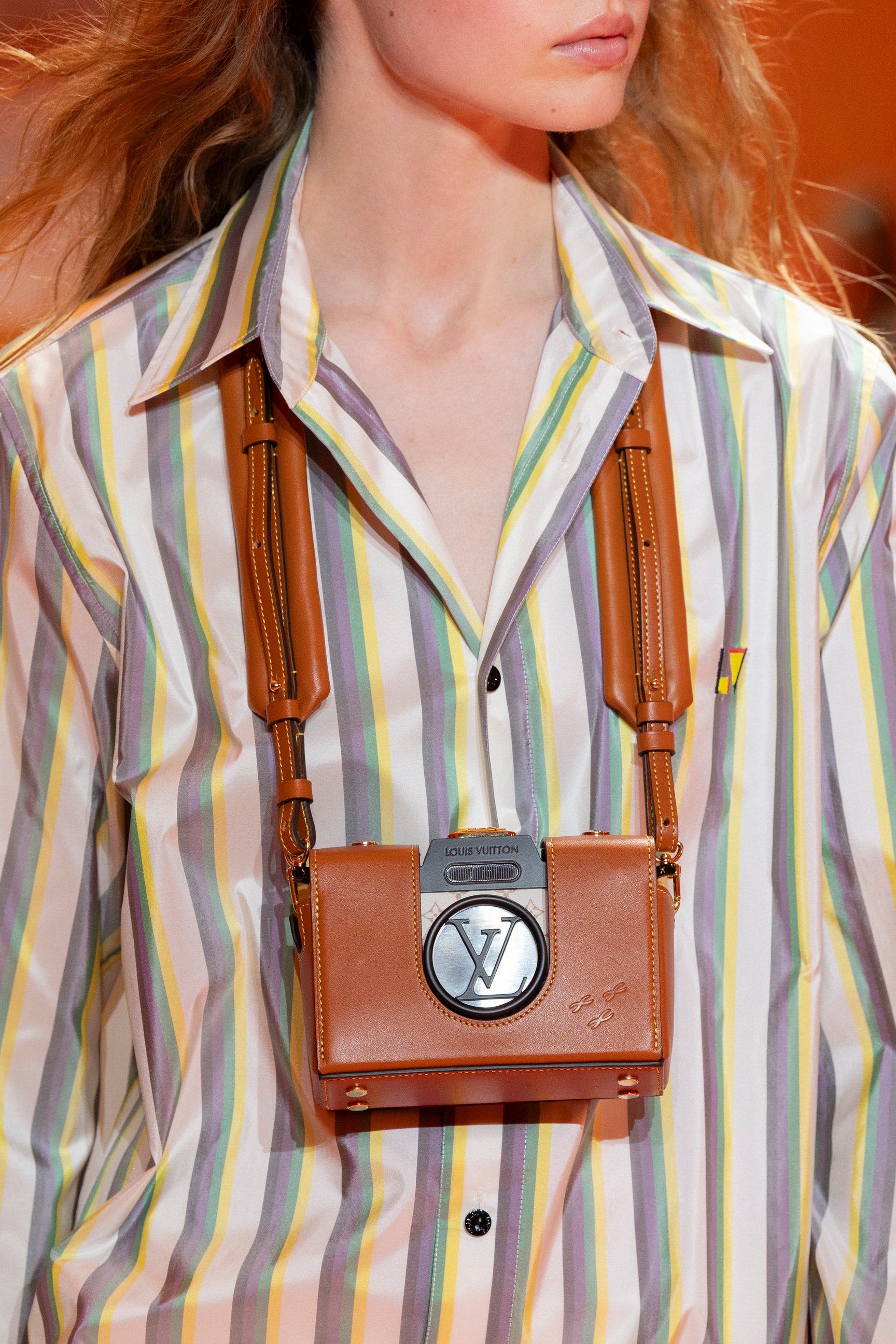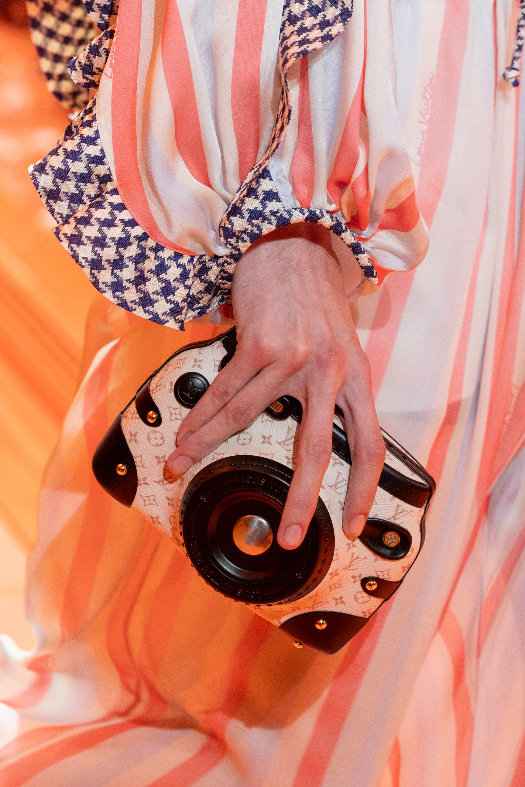また、アクセサリーも特徴的。日本の草履から着想を得たというシューズは親指だけが出ているデザインで、白いタイツがヴィンテージ風の雰囲気を引き立てる。ブランドのルーツである「旅」の要素をほうふつとさせるカメラバッグや、ルービックキューブ風のバッグには遊び心を感じさせた。重ね付けしたネックレスやボタンは華やかに装飾され、装いに重厚感ときらめきをプラスした。