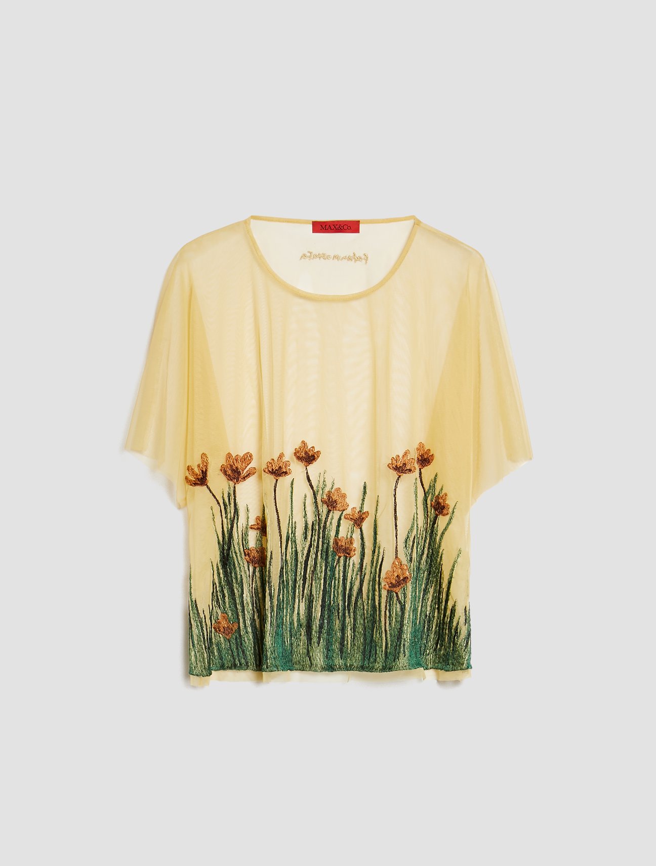 二つ目のカプセルコレクション「エルハム バイ ファトマ モスタファ(ELHAM by Fatma Mostafa)」は、エジプト出身の若手アーティスト/デザイナー/クラフトマンであるファトマ・モスタファとのコラボレーションによるもの。ゴールドプリントが施されたリブタンクはエネルギッシュなきらめきを放ち、アーティスティックなアクセサリーが彩りを添える。チーターをモチーフにしたバングルや、アフリカの風景を刺しゅうで描いたリングに巧みなクラフトマンシップを感じて。また、繊細なアップリケを施したチュールのTシャツ、モスタファ流に再構築したシグネチャーのMAX&Co.ロゴのTシャツもラインナップに並ぶ。