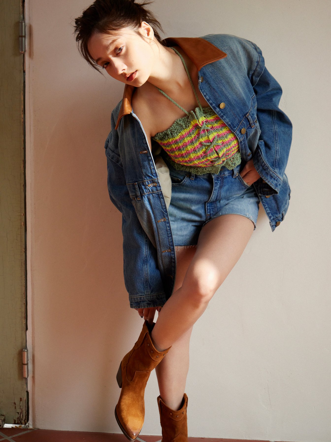 「メリダ」レザーディテール デニムジャケット 10万5600円、「イーカ」クロシェットニット トップ 3万6300円、「カンクーン」デニム ショート パンツ 3万9600円、「レオン」カウボーイ ブーツ 7万8100円