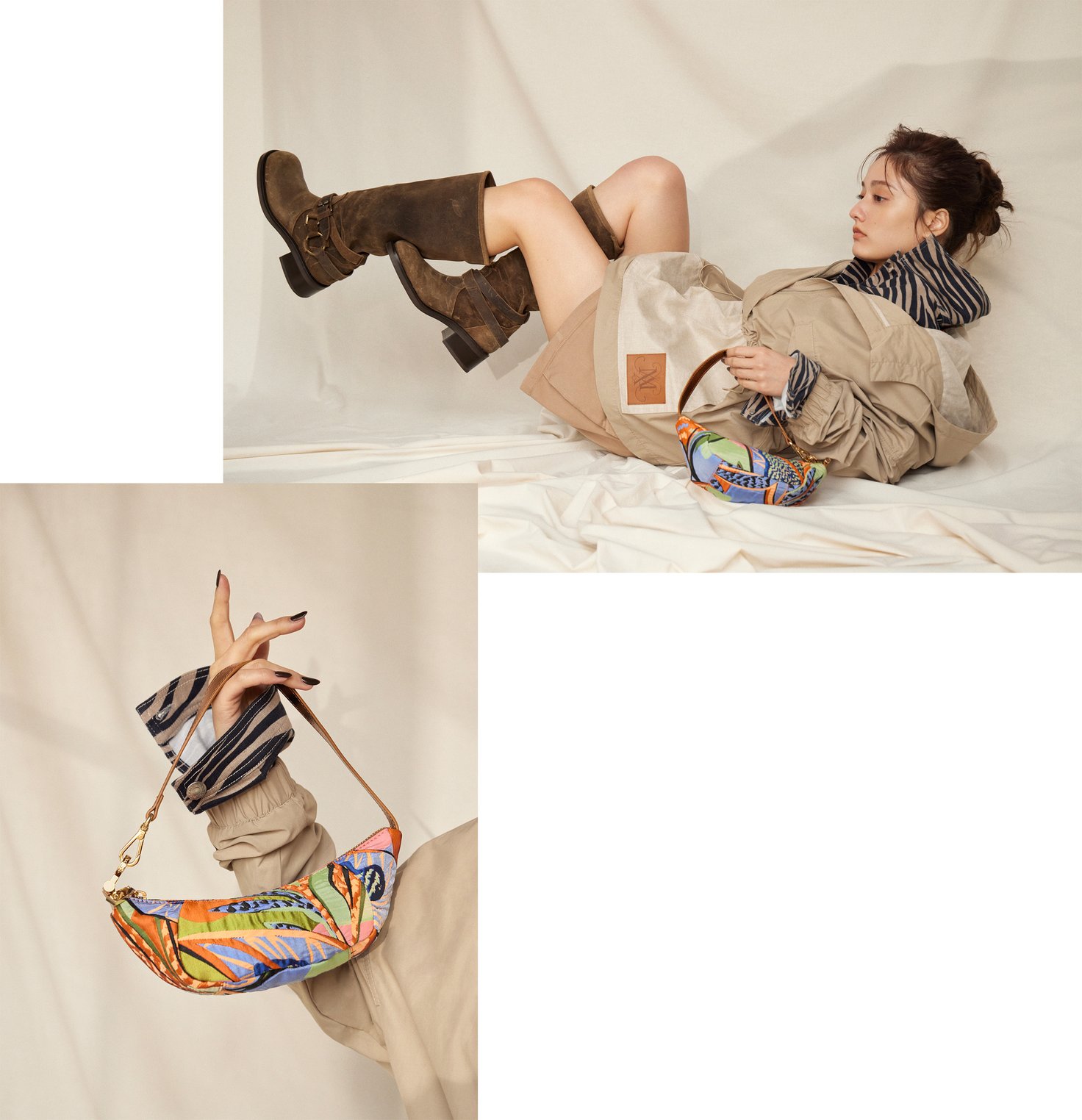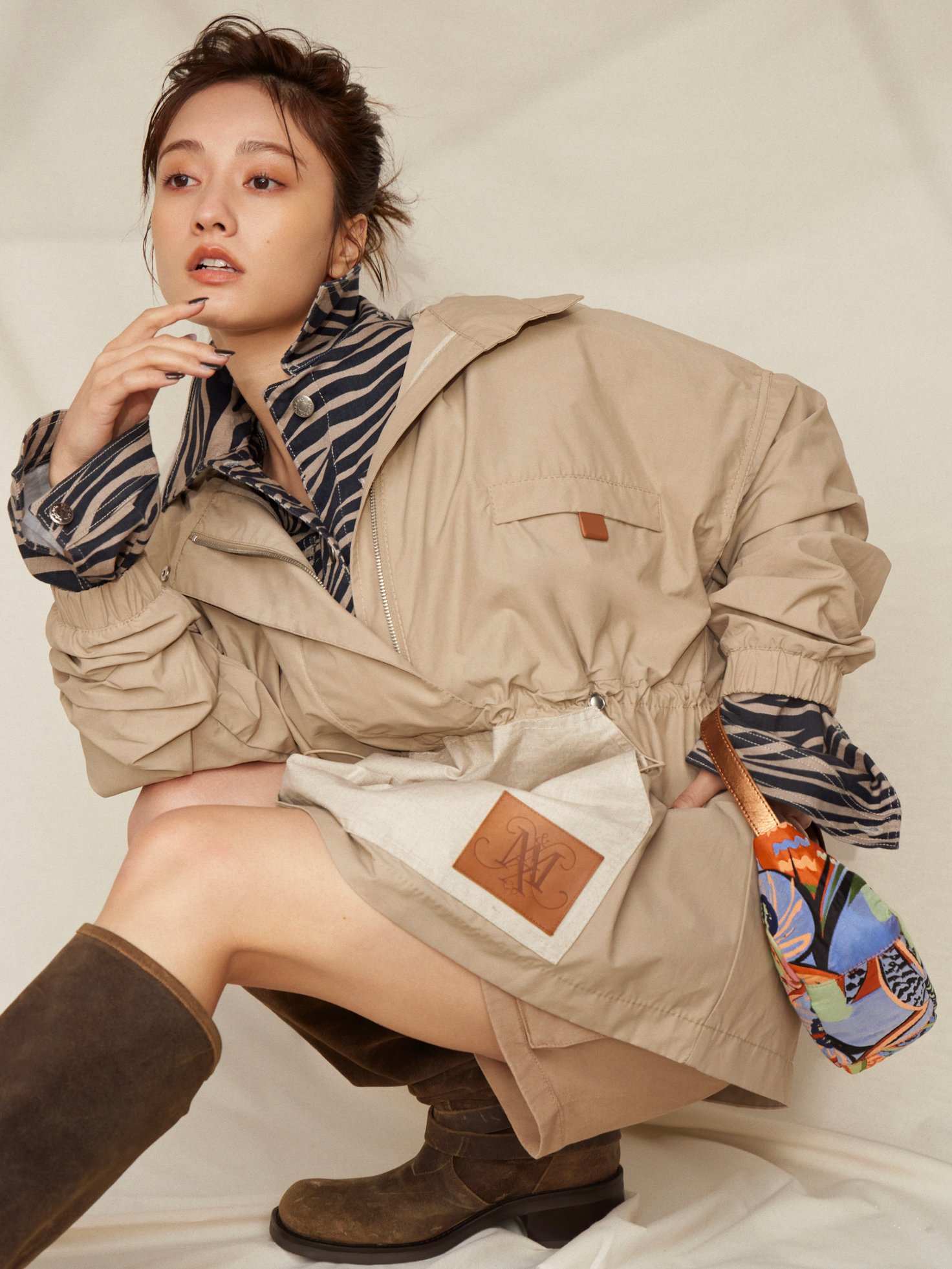 サファリの冒険を彷彿とさせる、今シーズンのMAX&Co.。特にこだわっているのが、テクニカルな軽量素材を取り入れたアウターウェア。フード付きのアノラックパーカーは、春の装いに取り入れやすいニュートラルカラー。ボクシーなシルエットで、ウエストを調整できるドローコードやフロントのビッグポケットなど機能性も抜群だ。ゼブラプリントのジャケットやスエードのブーツを合わせ、気分は都会の探検家。カラフルなジャカード織ホーボーバッグで遊び心をプラスして。