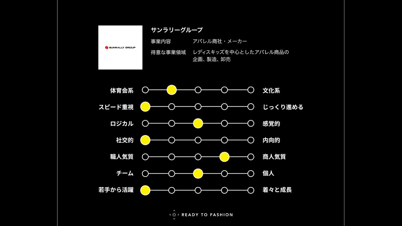 サンラリーグループ 磯村さん(以下、サンラリー 磯村):アパレル業界だけでなく、インテリアやウェディング業界なども視野に入れて就職活動をしてました。ですが、最終的には服に携わる仕事がしたいと思い、アパレル業界で就職をすることを決めたんです。中でも、大きな金額が動くビジネスであり、商品企画もできる川中の業種に魅力を感じました。