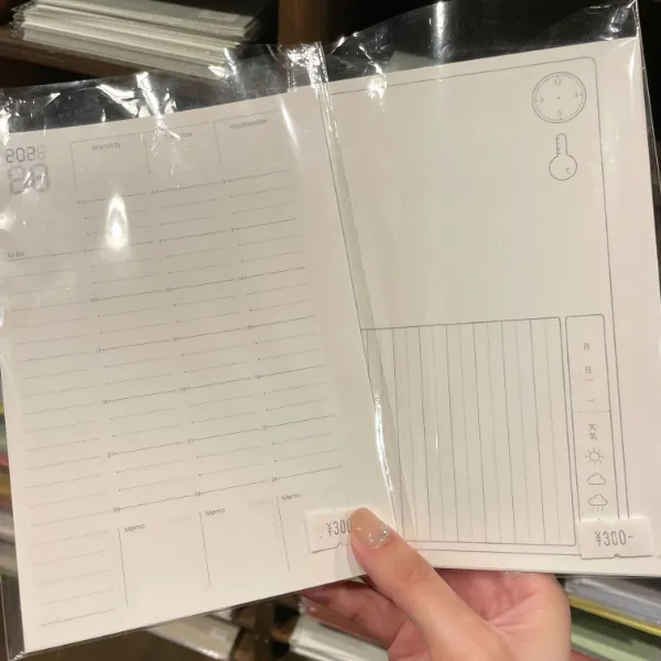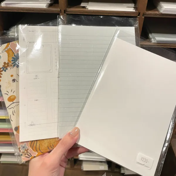 無地や罫線が入ったもの、レシピや日記が書けるデザインなど、たくさんの種類がありました。