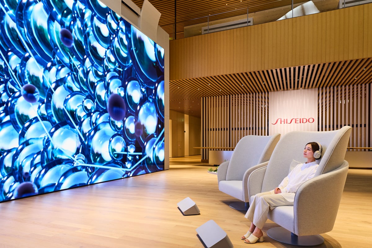 Shiseido Art & Science Labは、世界最大級の16K大画面を有する「ビューティー・リトリート・シアター(Beauty Retreat Theater)」を設置。人の感覚や心理といった主観的なものを客観的・科学的なアプローチで解き明かす40年以上の化粧に関する感性科学研究を応用し、AWE体験に着目した映像を放映する。AWEとは、日本語で「畏敬の念」を意味し、果てしない壮大な風景などを前に、自分の存在の小ささを知る体験のことを指す。畏敬のような美的感性がもつポジティブな効果の応用は、世界的に注目されている研究分野だという。また、2階には同社100年の歴史をベースにしたビューティやイノベーションにまつわるユニークな展示を4つのゾーンで紹介するミュージアムを展開する。