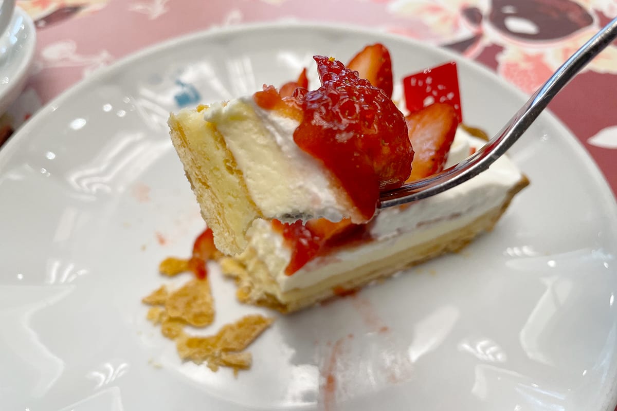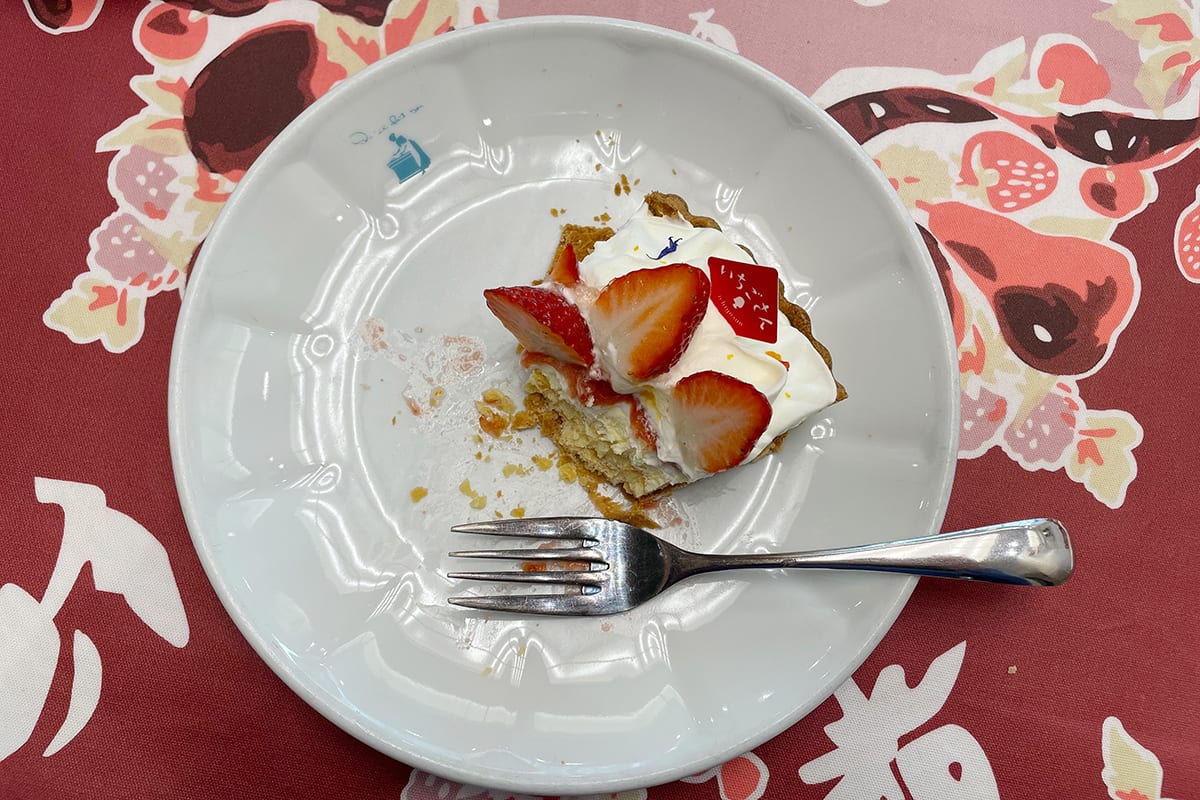 「いちごさん」のオリジナルピックが乗ったクリーム部分には、オレンジゼストとドライイチゴ、ブルーが美しいコーンフラワー(矢車菊)があしらわれていて、最後の一口までカラフルでポップな気持ちを楽しめた。