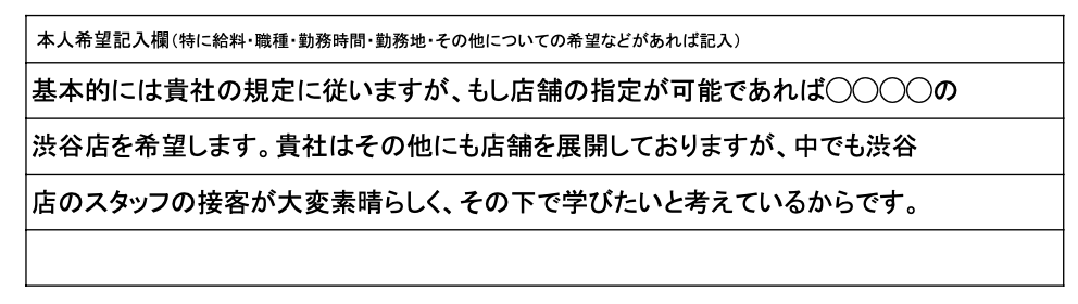 特定の店舗や地域がある場合は、「〇〇店での勤務を希望します」と明確に書くことで、採用担当者に、具体的なビジョンがあると伝わります。特に希望がなければ「貴社の規定に従います」と記入しましょう。