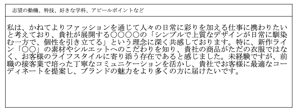 また、応募先のブランドがカジュアルなら親しみやすさを、ラグジュアリーブランドの場合は上品さを意識しましょう。
