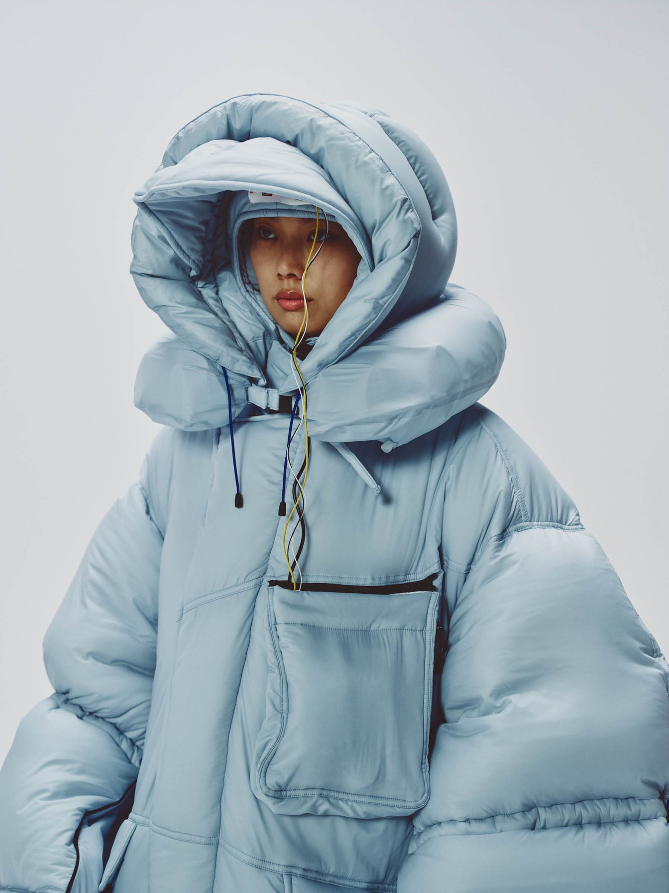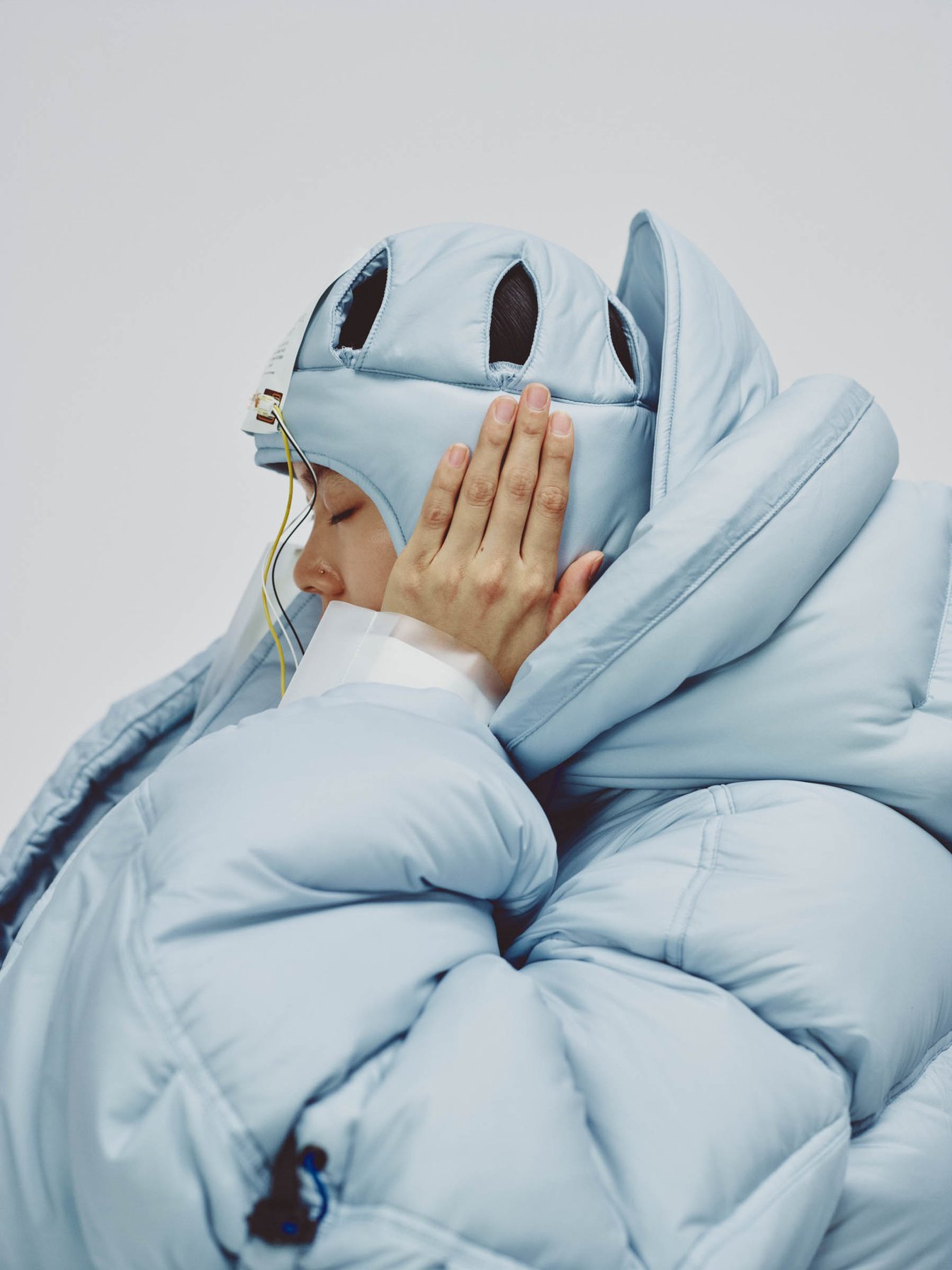 ロングダウンコートをベースとしたウェアデザインは、日本古来の布団をかぶったような防寒着「夜着」に着想。色は目に優しい淡いブルーを採用した。袖や裾のドローコードや袖口のタブによって圧着感を調整することで、着用者に合った寝やすさを提供し、ヘッドピースの上からフードを被ることで着用時の眠気や温度、周辺環境に合わせて調整が可能。着脱型フードエアパック入りの襟は、サポート構造で首元を支え、睡眠中の安定感を向上させることで首や肩の負担を軽減する。エアパックは呼気吹き込み式を採用し、好みの大きさに調整ができる。なお、今後の商用化に向けて、コートやヘッドギア以外のアイテムの展開も予定している。