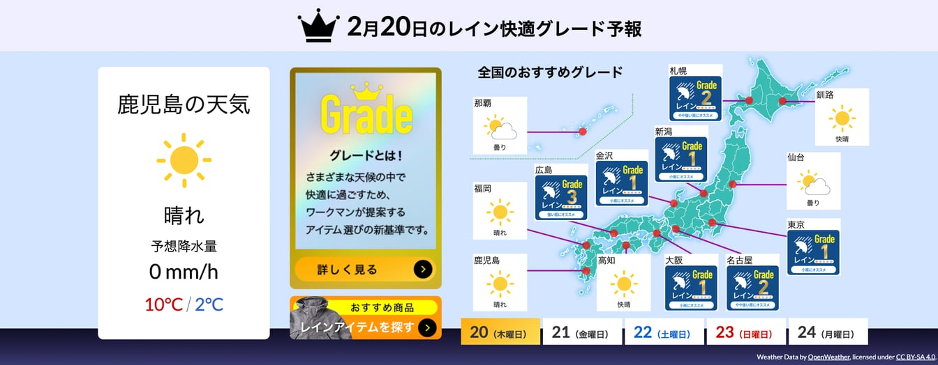 また、「ワークマンの製品は機能が多すぎて何を選べばいいのか分からない」という顧客の声を反映し、ホームページに新機能「機能の格付け」を実装。プログラミング言語のパイソン(Python)を用いて社員が作成したものに気象庁から提供を受けたデータを埋め込み、天候に応じて1〜5のグレードで製品を提案する。
