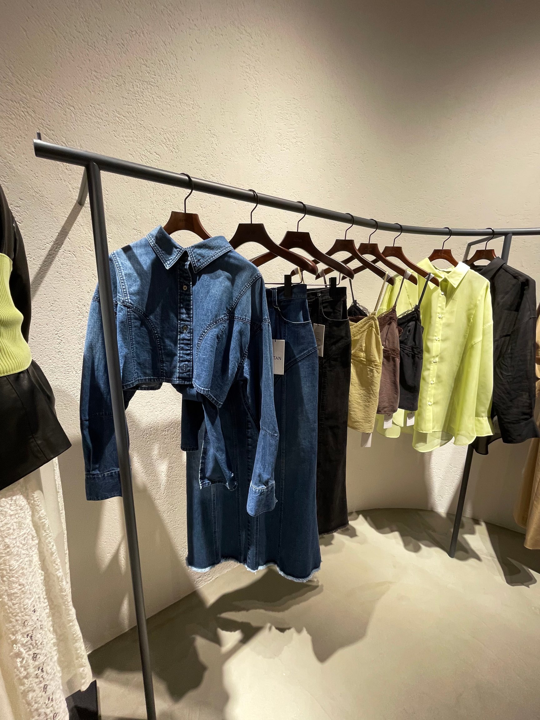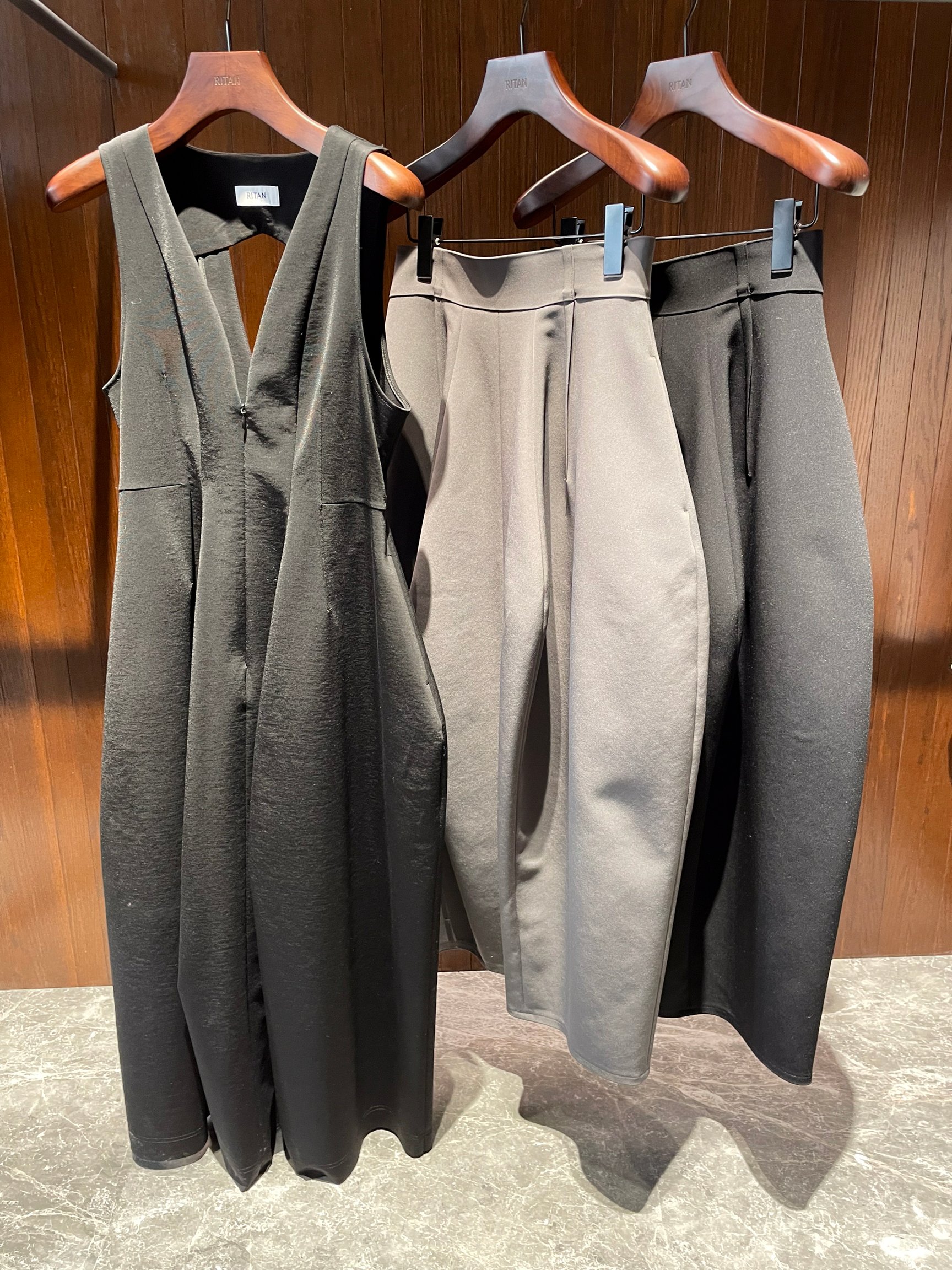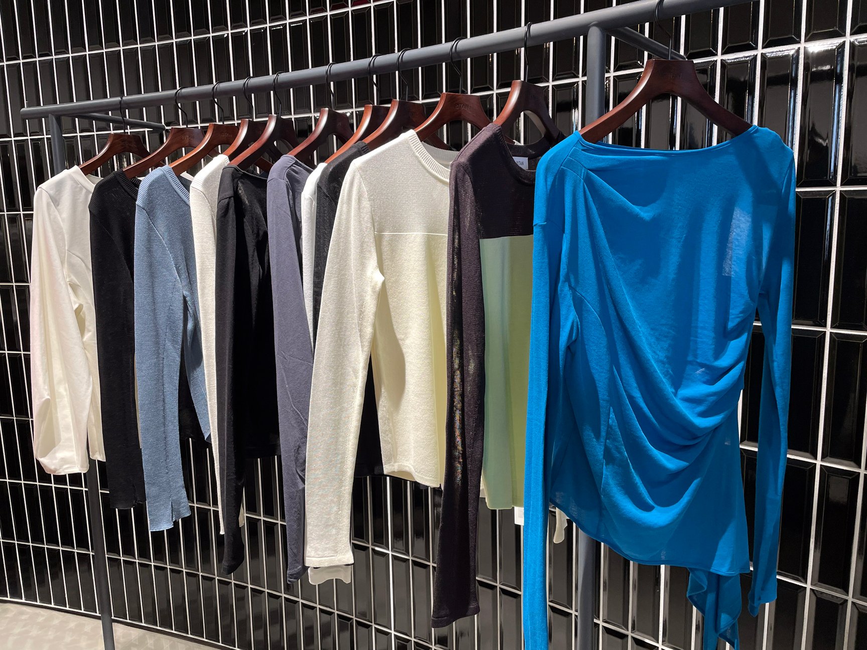 オープン時の店頭では、ファーストコレクションで製作した35型をラインナップ。大阪の工場で生産したラムレザージャケットや、身体の曲線が強調されるようにサイドを絞ったニットカーディガン、細身のボトムスと合わせてもバランスが取りやすい設計にしたビッグシルエットのシャツなどを揃え、一部のアイテムにはアイコンとしてブランドロゴ入りの2連のカシメをあしらった。価格帯はTシャツやスウェットなどの軽量なアイテムは1万〜2万5000円、シャツとブラウスは2万3000〜4万円、ワンピースとパンツ、スカートなどのボトムスは2万5000〜4万円、ジャケットやコートは4万〜7万円で展開し、軽量のものは価格を抑えつつ、ジャケットなどはフォーマルウェアとしても選びやすいような価格帯を意識したという。