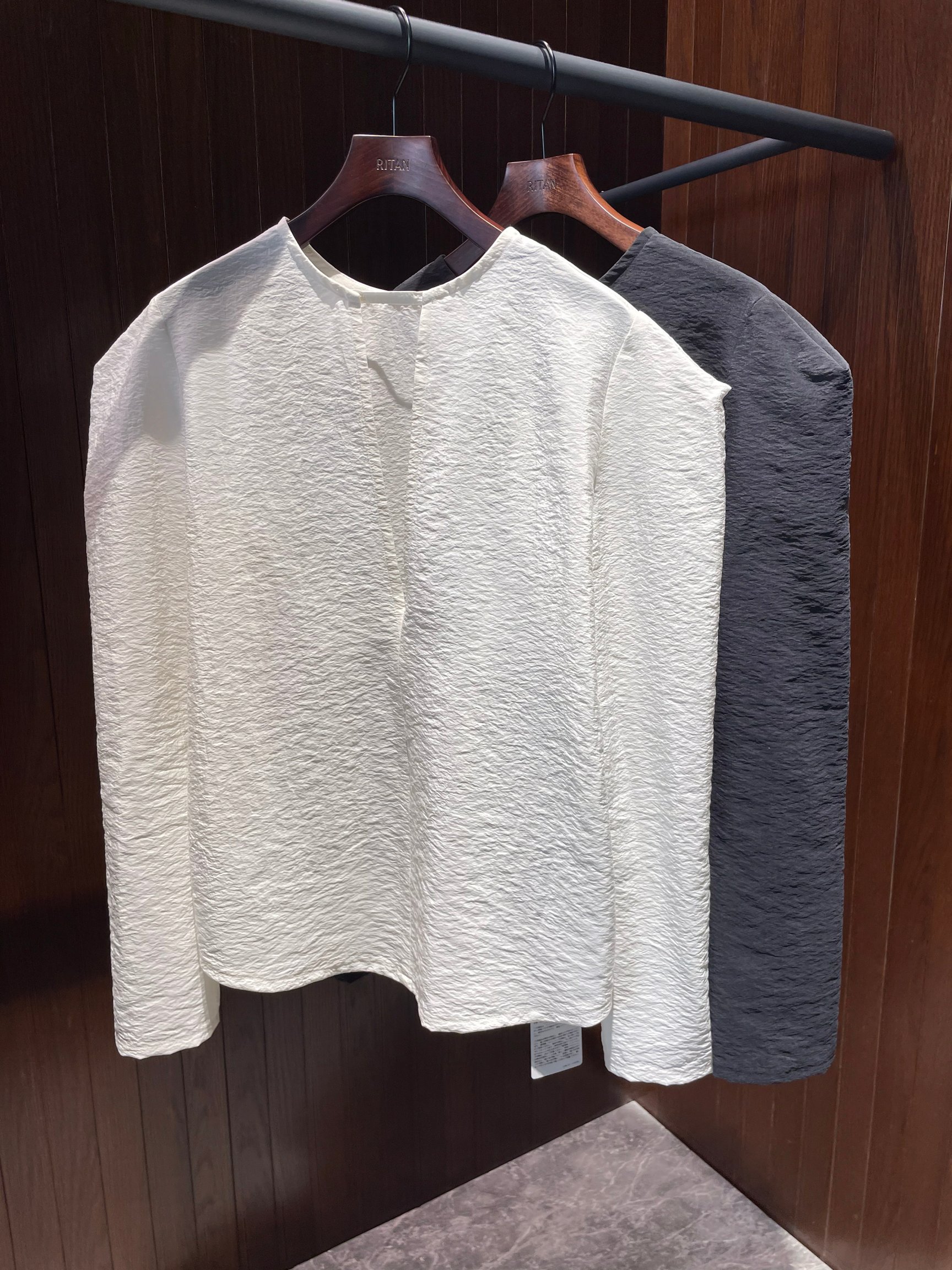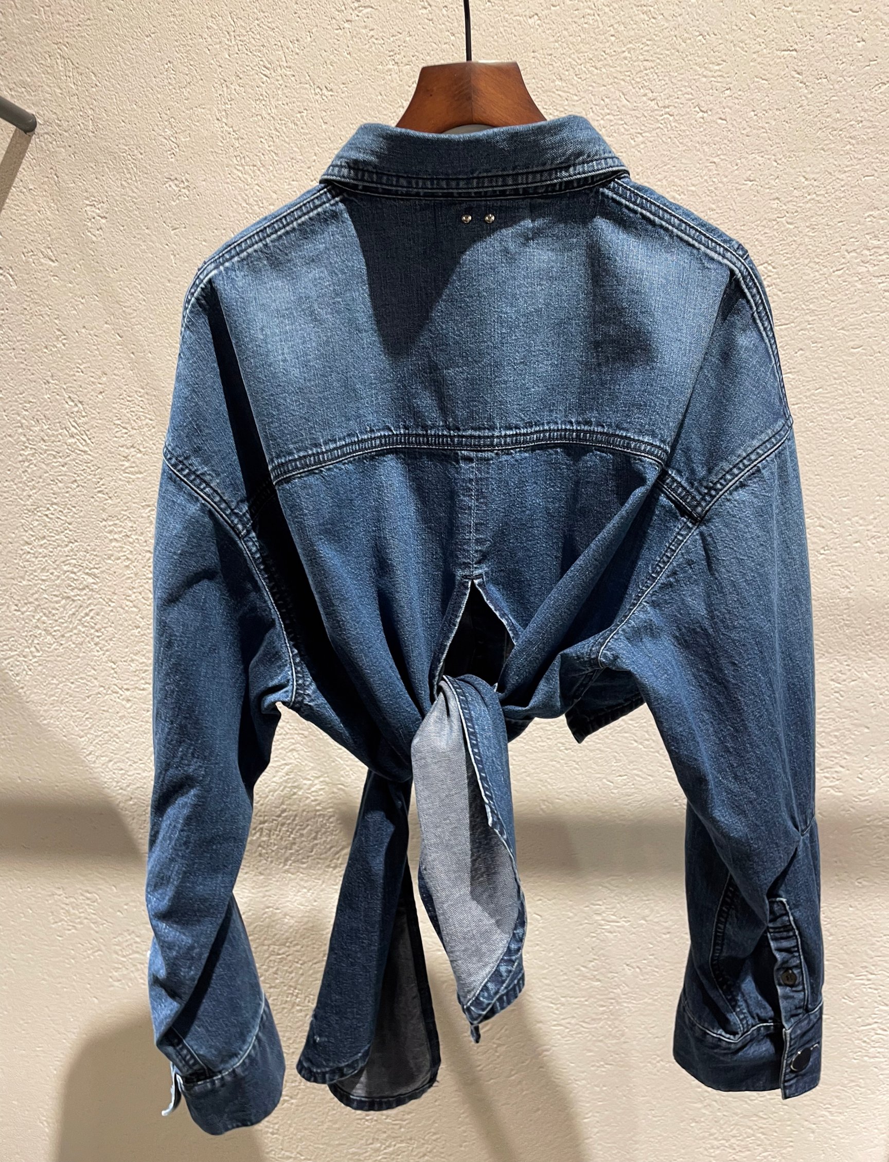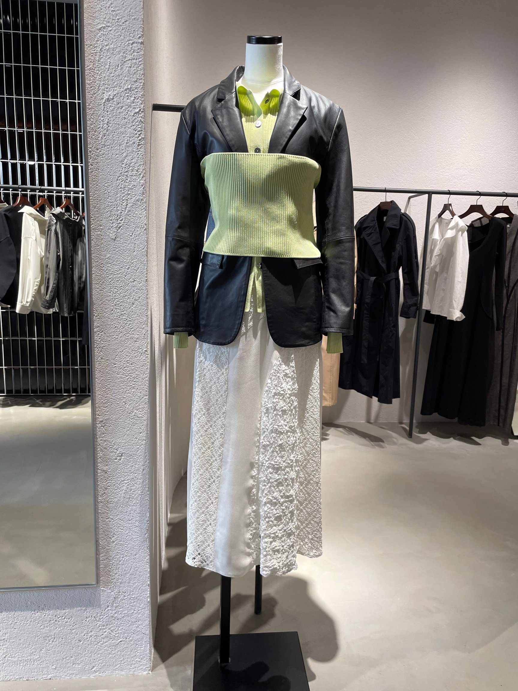 オープン時の店頭では、ファーストコレクションで製作した35型をラインナップ。大阪の工場で生産したラムレザージャケットや、身体の曲線が強調されるようにサイドを絞ったニットカーディガン、細身のボトムスと合わせてもバランスが取りやすい設計にしたビッグシルエットのシャツなどを揃え、一部のアイテムにはアイコンとしてブランドロゴ入りの2連のカシメをあしらった。価格帯はTシャツやスウェットなどの軽量なアイテムは1万〜2万5000円、シャツとブラウスは2万3000〜4万円、ワンピースとパンツ、スカートなどのボトムスは2万5000〜4万円、ジャケットやコートは4万〜7万円で展開し、軽量のものは価格を抑えつつ、ジャケットなどはフォーマルウェアとしても選びやすいような価格帯を意識したという。