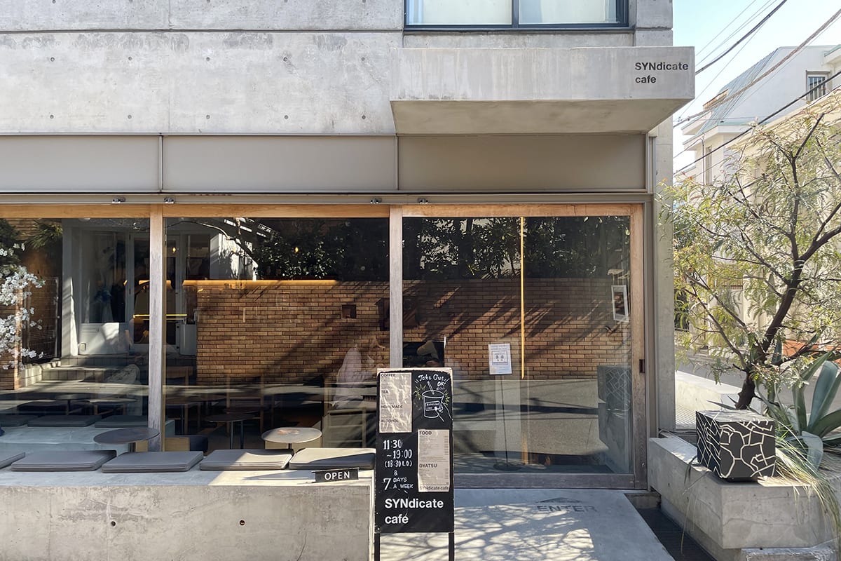 無機質なコンクリートで覆われながらも、大きく開放的な窓とのギャップが不思議な落ち着きを生み出す「SYNdicate cafe」。