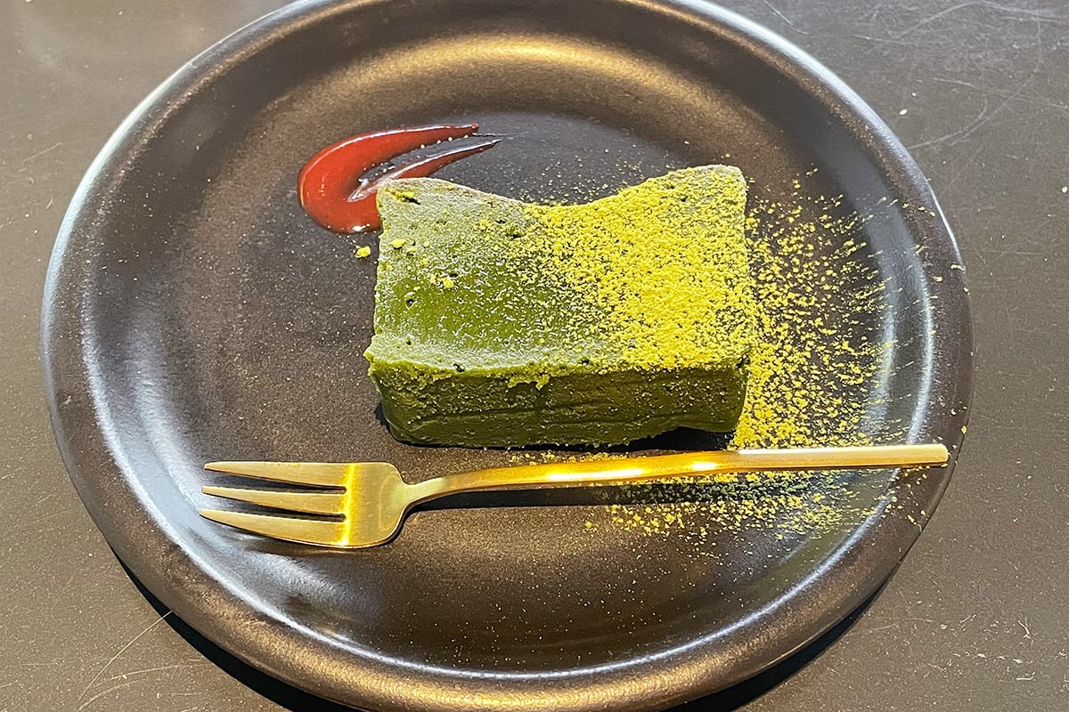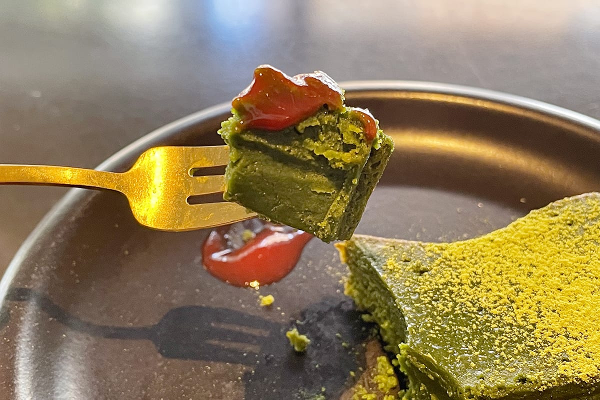 フォークに圧をかけて、ぎゅっと詰まったテリーヌを丁寧に切り分ける。滑らかな断面を眺めながら口に運ぶと、予想を超えた濃〜い抹茶ととろけるような甘味がじゅわ〜っと広がっておいしい。口の中にずっと留めておきたくなるような濃厚さ。