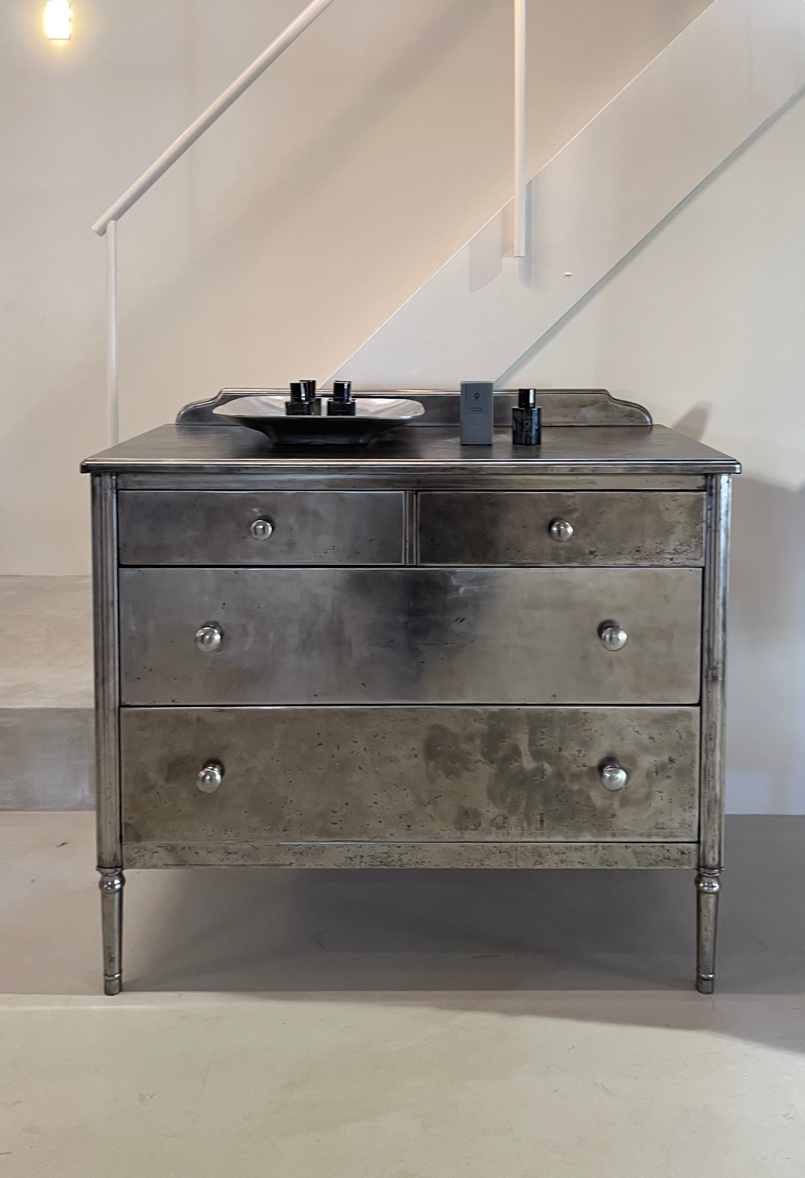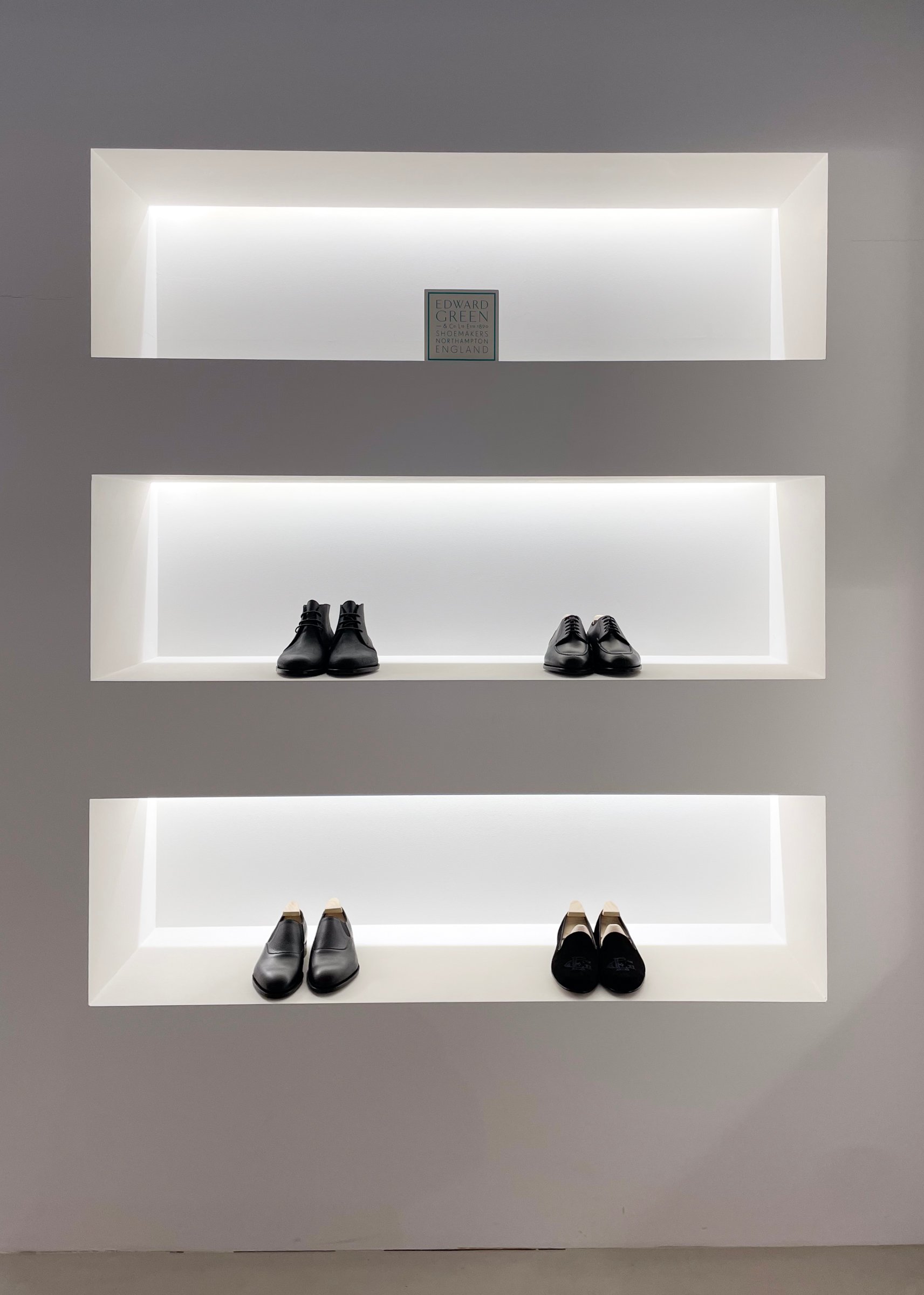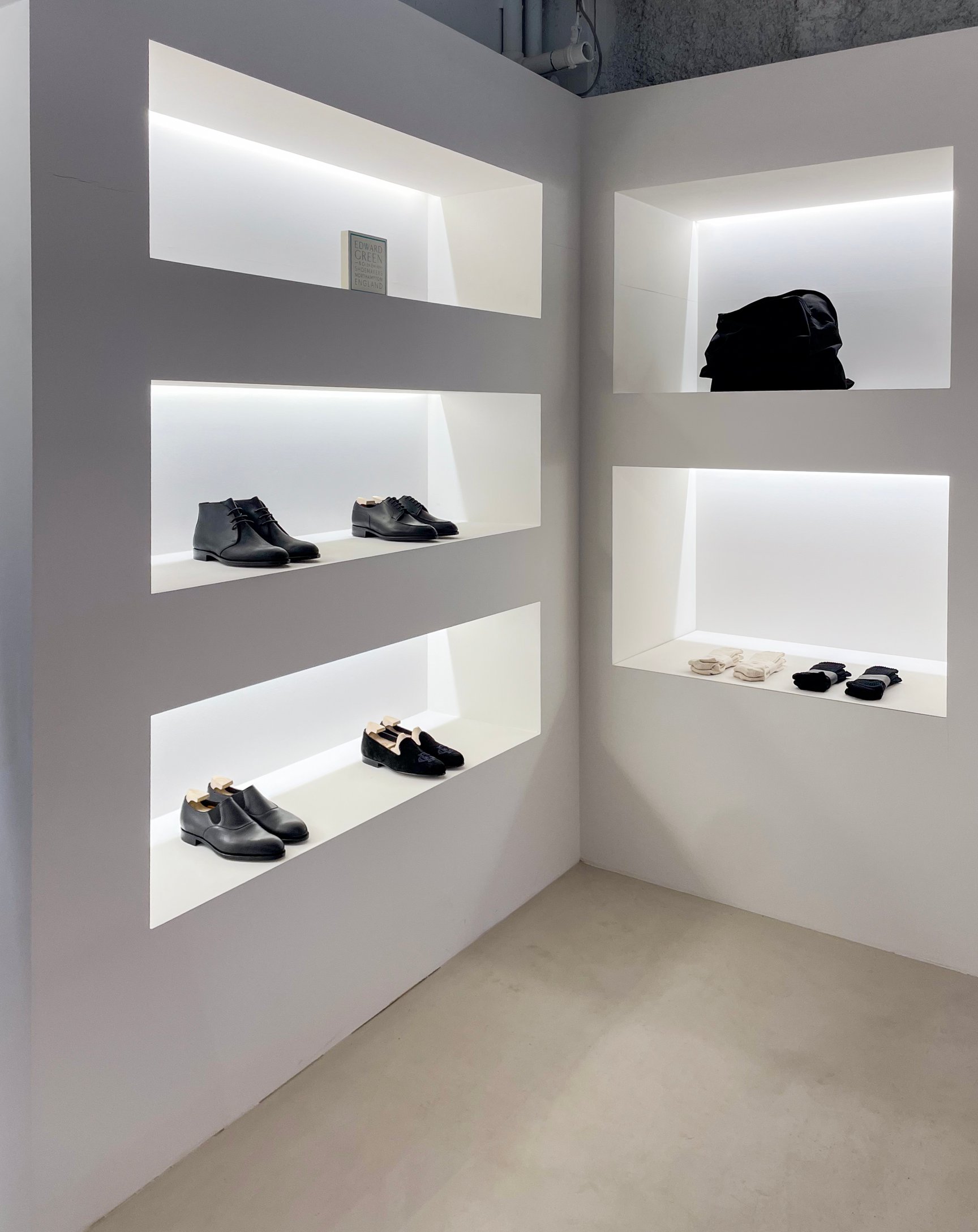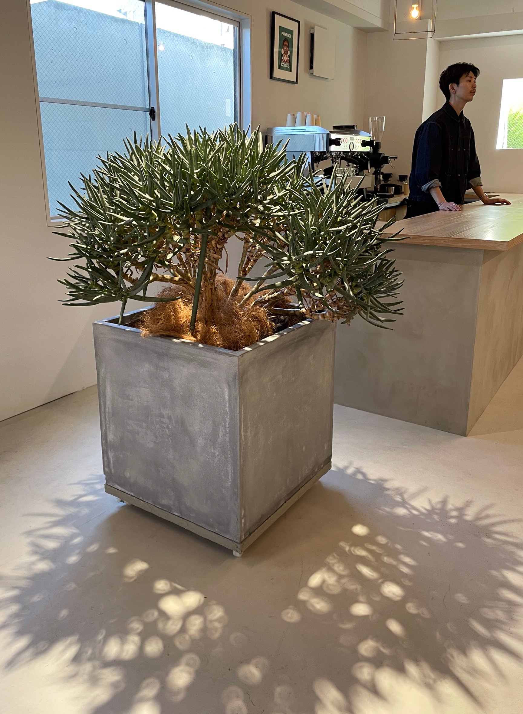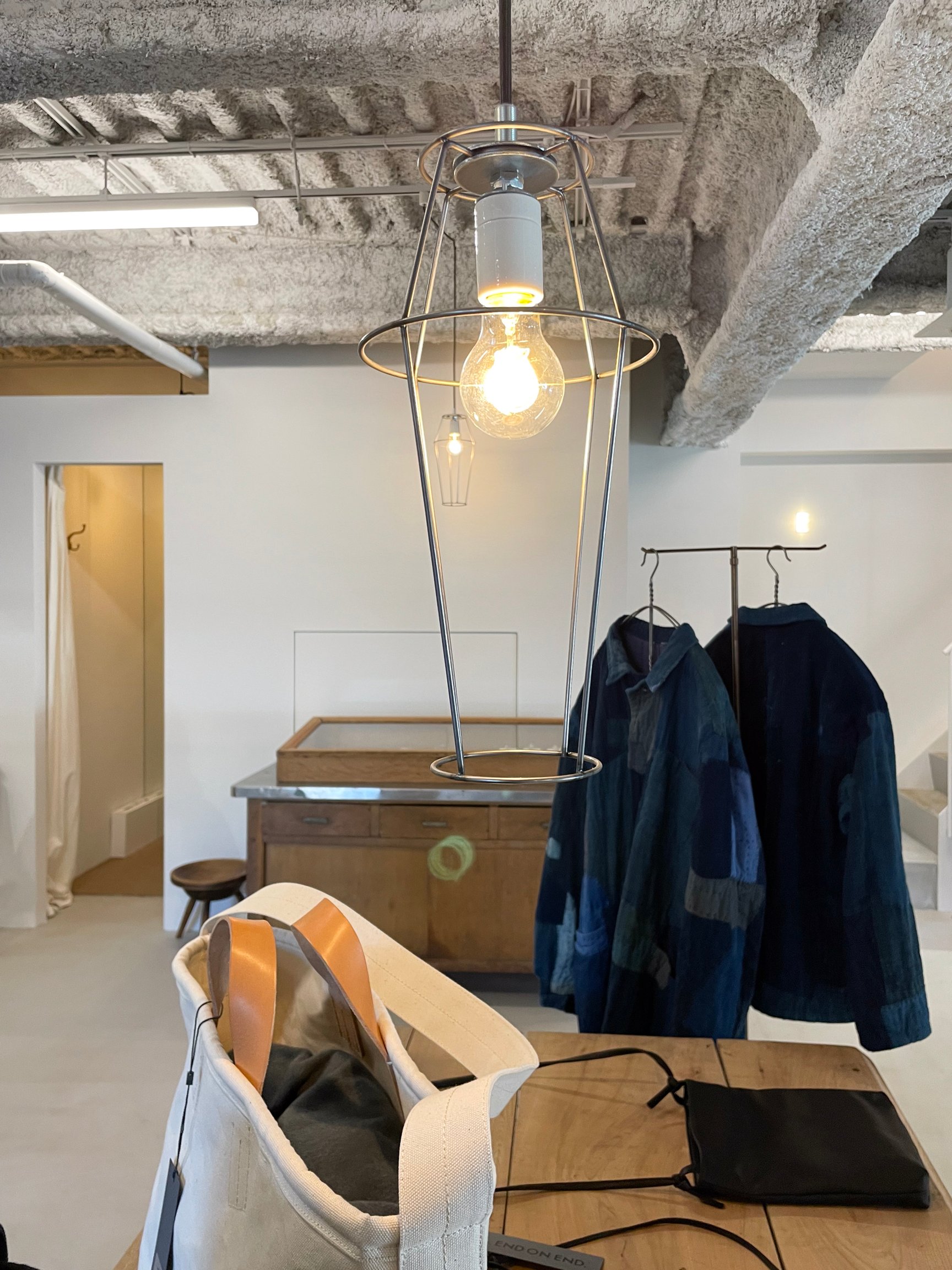 エンド オン エンドは、地上1〜4階の4フロアで構成。1階の店舗と2階のショールームスペースで商品を取り扱い、3階はオフィス、4階はミシンやアイロン、洗濯機、乾燥機などを備えるアトリエとなる。1階の店舗は、デザイナーの村上が魅力を感じるという「相反するバランス」をコンセプトに、自然と人工物それぞれの美しさを融合させたリラックスできる空間を演出。コンクリートの質感を活かしつつ、山梨の造園屋「Yard Works」を手掛けるKEI AMAMOの植栽を随所に配置した。また、ハンガーや照明器具など一部のディスプレイツールは村上がデザイン。同店のためにオーダーした新品に加え、村上の私物のヴィンテージ家具や、香川県に倉庫を構えるヴィンテージショップ「dodo」から買い付けた家具を設えた。店の奥にはオリジナルコーヒースタンド「MORENCI COFFEE」を設置し、日替わりのバリスタによるコーヒーを販売する。