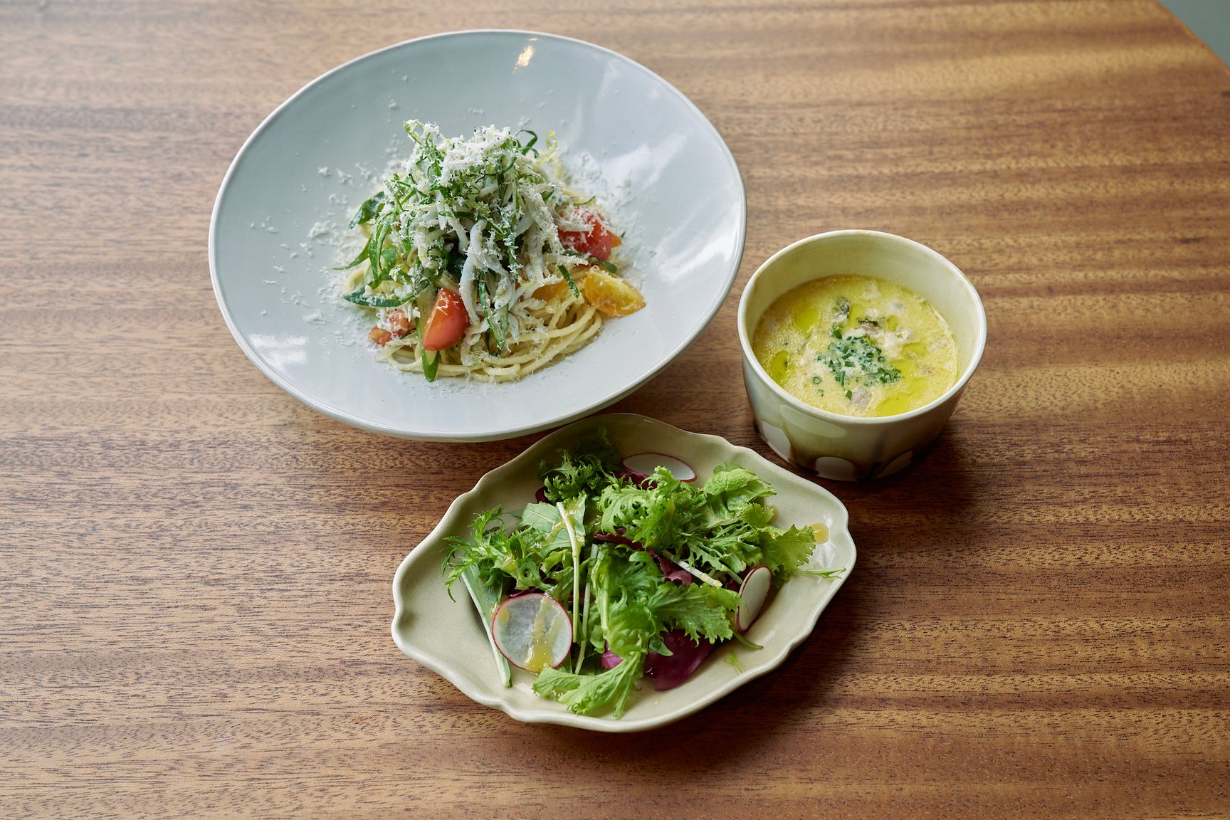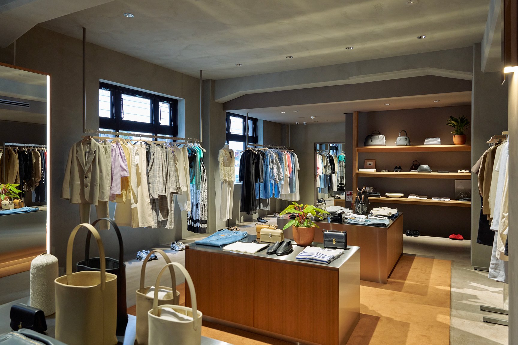 1階にはカフェ&レストランとコスメ・ライフスタイルを、2階にはアパレルとイベントスペースを展開。2階ではジュエリーやアイウェアのラインナップを幅広く揃える。1階のレストランはワインセラーを備え、酒類のラインナップも充実。ドリンクやデザート、ベーカリーメニューはテイクアウト可能。レストランを大きく構えた代わりにボタニカルを取り扱わない神戸店では、店頭の各所に植物を配置することでビオトープらしさを表現する。
