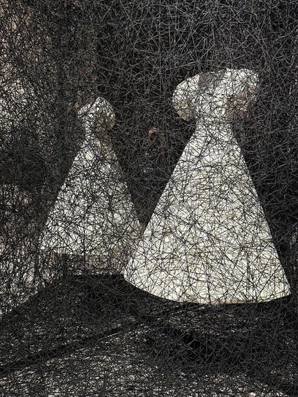 彼女の代表的な作品といえば、絡み合う毛糸が空間を覆い尽くすインスタレーション。来場者はその網の目の中に足を踏み入れ、自らの「場所」を見つけながら進む。「不確かな旅(Uncertain Journey)」 というタイトルが示すように、観る者は自分の存在を問い直す旅へと導かれる。