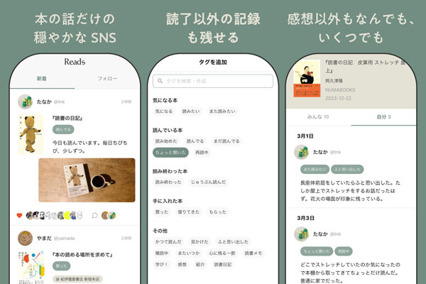もともと余暇の時間をゆるっと楽しむための場所だったSNSは、次から次へと流れてくる刺激の強いコンテンツ、気になってしまういいね数やフォロワー数、下手なことを言ったら炎上しそうで怖いなど、様々な脅威や不安を感じるものになってきている。「Reads」は、本の話だけのSNSとして、本が好きな人が心穏やかに過ごせる広場のような場所を目指している。いいねやフォロー/フォロワーは数値化されず、投稿ごとに公開範囲を設定でき、リポストはない。