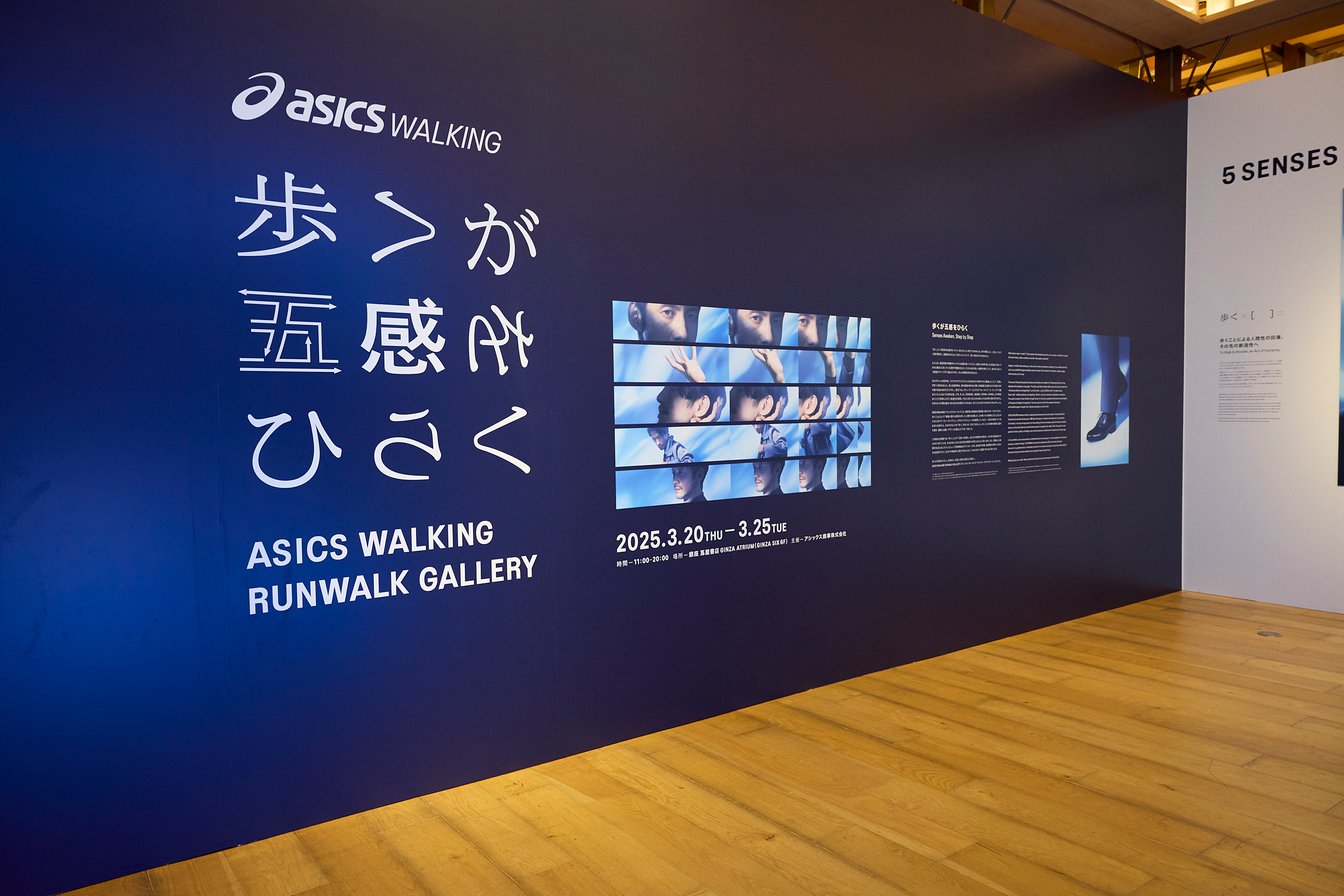 同展のテーマは、「歩くが五感をひらく」。「走れるビジネスシューズ」をコンセプトに、アシックスのランニングシューズや競技用シューズにも採用されている素材や機能構造を取り入れた高機能なドレスシューズ「ランウォーク」の歴史を振り返りながら、同ブランドが大切にしている「歩く」という行為について見つめ直すきっかけとなる展示を行っている。