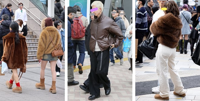 今冬多く見られるのは、当時に比べて濃い茶色。トレンチコートはすっかりその影を潜め、前述のレザー系アウターやファー/ボアアウターが人気の中心になっています。古着がブームを超えて定着したZ世代にとって、ヴィンテージライクでクラシカルな茶色は馴染みの色。また、実は90~00年代前半の定点観測でも盛んに茶系(ベージュ)アイテムは取り上げられており、コギャルたちが好んで着用した歴史も。ギャルテイストのリバイバルという文脈ともリンクしていると考えられそうです。