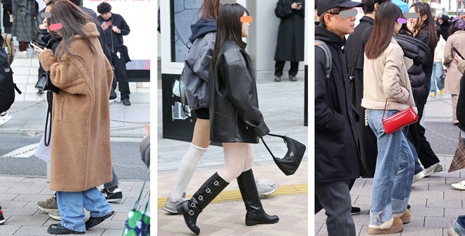 早くも2025年2回目の定点観測となりました。とはいっても街の雰囲気はたった2週間ほどで大きく変化するはずもなく、相変わらず普通に黒ダウンも多いのですが、先月注目したファーアウターを中心とした00s前後のギャルっぽいムードがやはり新鮮に映るということで、今月は彼女たちの多くが持っている「女性横長バッグ、うちハンドルバッグ」に注目してみることに。ズームアップアイテムは、脱・黒の流れからグレーについで浮上してきた「茶系アウター」と、やはりギャルテイストの人気を反映した「レオパード柄」をそれぞれ取り上げました。