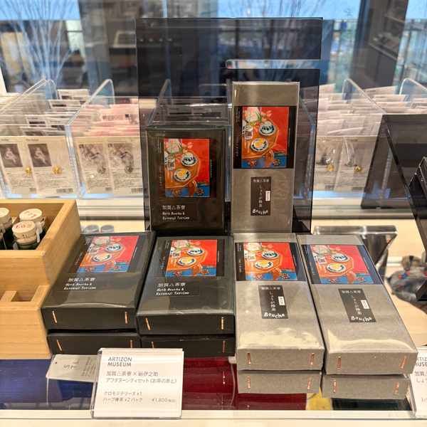 陶磁器制作のためにたびたび滞在した加賀にちなんだ、「加賀△茶寮 × 硲伊之助 アフタヌーンティセット(写真左)」(税込1800円)や「加賀△茶寮 × 硲伊之助 しょうが棒茶 3パック入(写真右)」(税込900円)は、ちょっとしたギフトにもぴったりですよ。