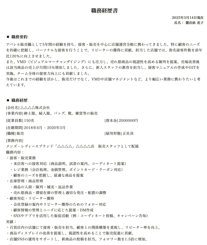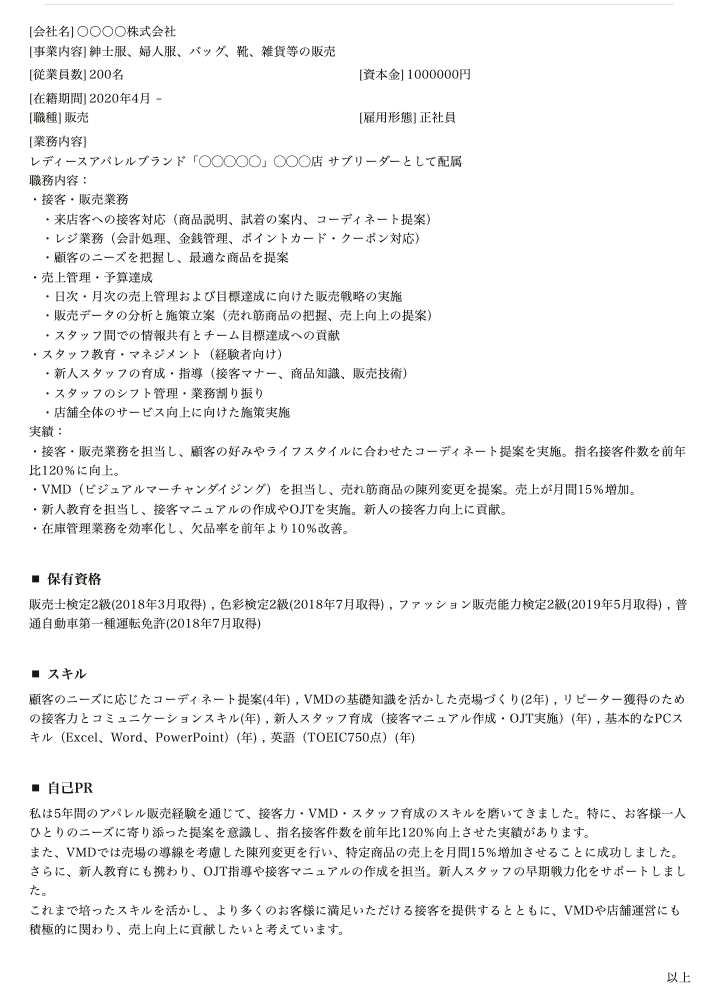 職務内容:・接客・販売業務 ・来店客への接客対応(商品説明、試着の案内、コーディネート提案) ・レジ業務(会計処理、金銭管理、ポイントカード・クーポン対応) ・顧客のニーズを把握し、最適な商品を提案・売上管理・予算達成 ・日次・月次の売上管理および目標達成に向けた販売戦略の実施 ・販売データの分析と施策立案(売れ筋商品の把握、売上向上の提案) ・スタッフ間での情報共有とチーム目標達成への貢献・スタッフ教育・マネジメント(経験者向け) ・新人スタッフの育成・指導(接客マナー、商品知識、販売技術) ・スタッフのシフト管理・業務割り振り ・店舗全体のサービス向上に向けた施策実施実績:・接客・販売業務を担当し、顧客の好みやライフスタイルに合わせたコーディネート提案を実施。指名接客件数を前年比120%に向上。・VMD(ビジュアルマーチャンダイジング)を担当し、売れ筋商品の陳列変更を提案。売上が月間15%増加。・新人教育を担当し、接客マニュアルの作成やOJTを実施。新人の接客力向上に貢献。・在庫管理業務を効率化し、欠品率を前年より10%改善。