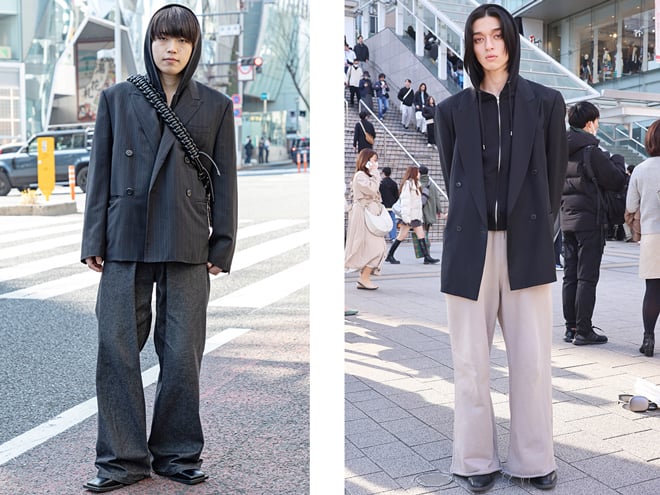 (左)「ナットエンペラーのバッグをメインにスタイリングを組みたくて同系統のフーディーを合わせました」という23歳の男性(https://www.web-across.com/observe/ppce54000000hgjm.html)。 (右)「OUR’sを見てジャケットとフード付きスウェットでドレスとカジュアルのバランスをとるスタイルにしようと決めました」という20歳の男性(https://www.web-across.com/observe/ppce54000000hh54.html)。
