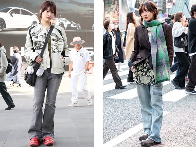 (左)「フレアジーンズをはいてきたのは、いろいろ動く日だったし、クラブにも行くこともあったので脚を出したくないなと思って」という22歳の女性(https://www.web-across.com/observe/ppce54000000hfvq.html)。(右)「フレアデニムはトップスとボトムスのバランスが取りやすいので気に入っています。ワイドなボトムスよりも女性らしいピッタリとしたラインが出るのでフレアデニムは重宝しています」という24歳の女性(https://www.web-across.com/observe/ppce54000000hgt6.html)。