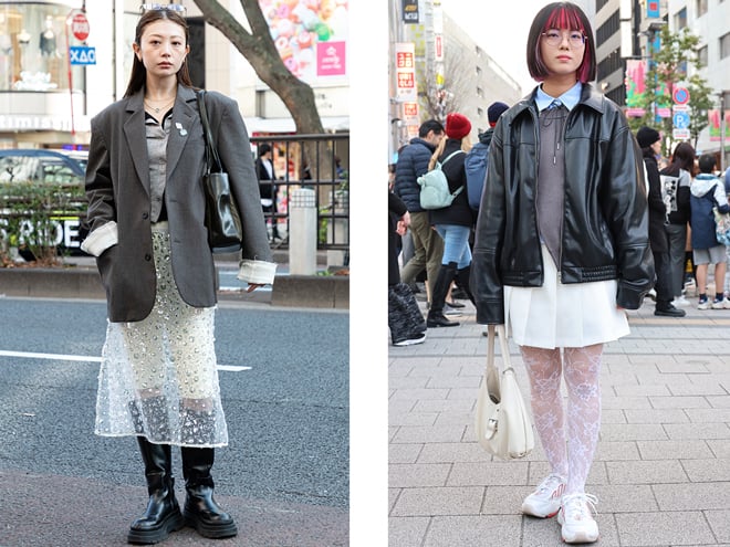 (左)「このレースのスカートはキラキラに目がいきました」という28歳の女性(https://www.web-across.com/observe/ppce54000000hgvk.html)。(右)「1年前に流行り始めた頃から割とよくシースルーのタイツを履いている」という21歳の女性(https://www.web-across.com/observe/ppce54000000hhjg.html)。