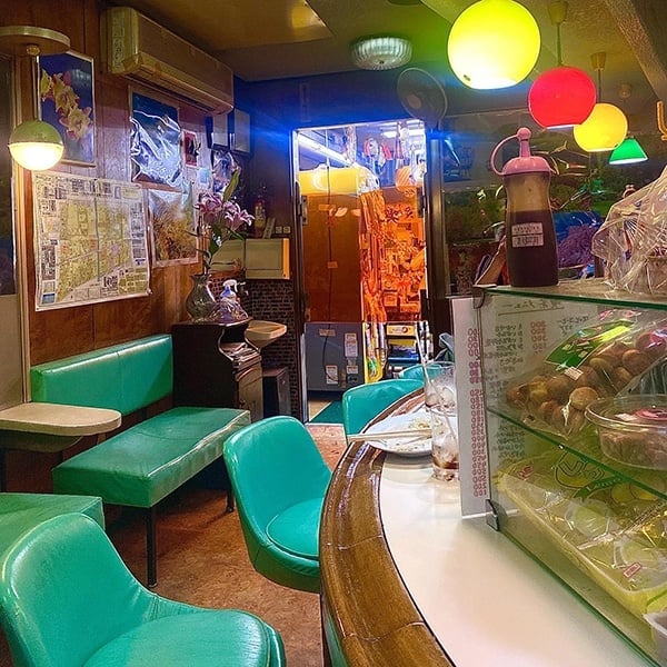 カラフルなイスとライトが目をひく店内は、昭和レトロな雰囲気が◎