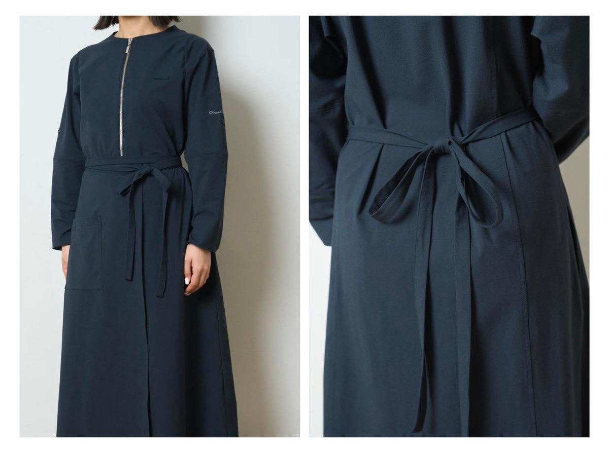 新デザインは、自分に合った着こなしを楽しめるワンピースとエプロンの一体型。エプロンのリボンは結ぶ位置を前と後ろで変えることで、雰囲気の異なる着用スタイルを可能に。タッチアップなど、顧客への繊細な作業が求められることから、袖はタイトに、またロールアップができるようベルトを取り付けた。また、ペンなどを取り出しやすい動線を考慮してポケットを手元に近い位置にした。生地はGRS認証のリサイクルナイロンなどサステナブル素材で、シワになりにくく接触冷感性とストレッチ性も加味した。