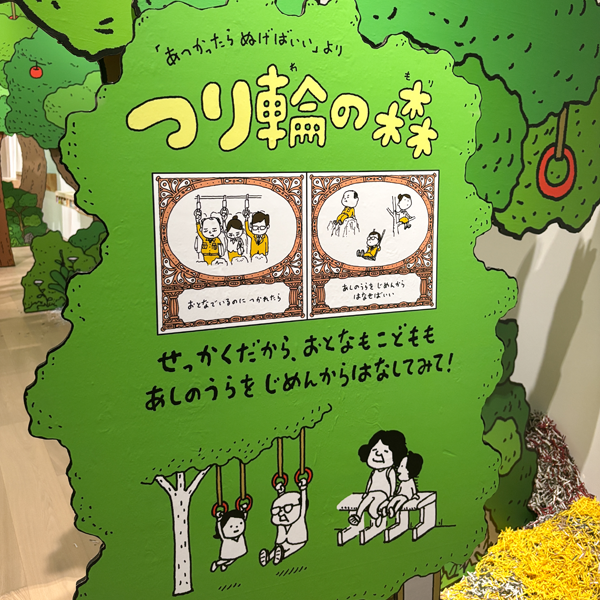 絵本『あつかったら ぬげばいい』の中に登場する、「おとなでいるのにつかれたら あしのうらをじめんからはなせばいい」という一節を、つり輪にぶら下がりながら体験できますよ。