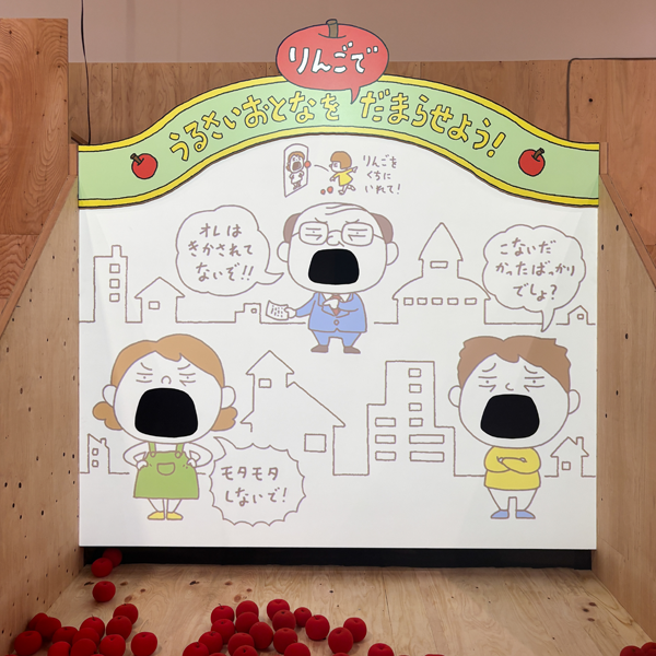 あえて「つまんないかお」で撮影するフォトパネルや、座り心地の悪い「じごくのトゲトゲイス」、りんご形のボールを投げて遊ぶ「りんごでうるさいおとなをだまらせよう」など、大人も楽しめるコンテンツが盛りだくさん!