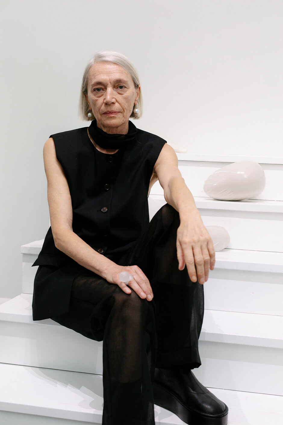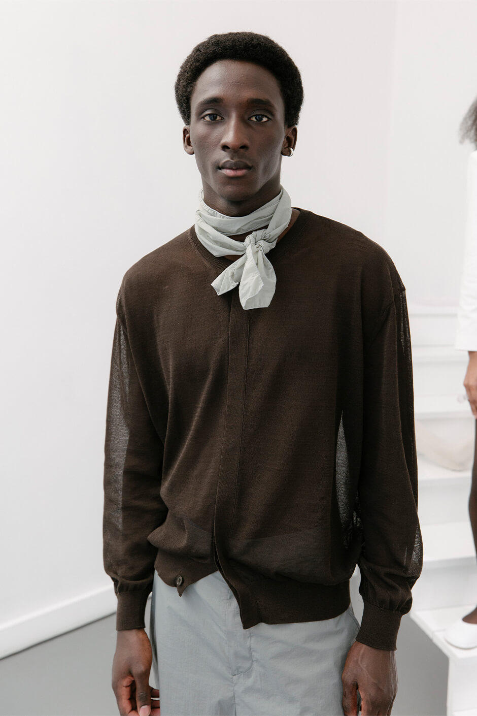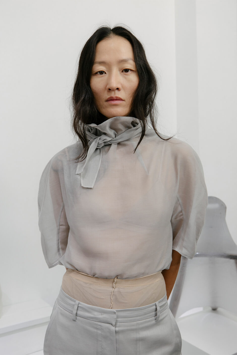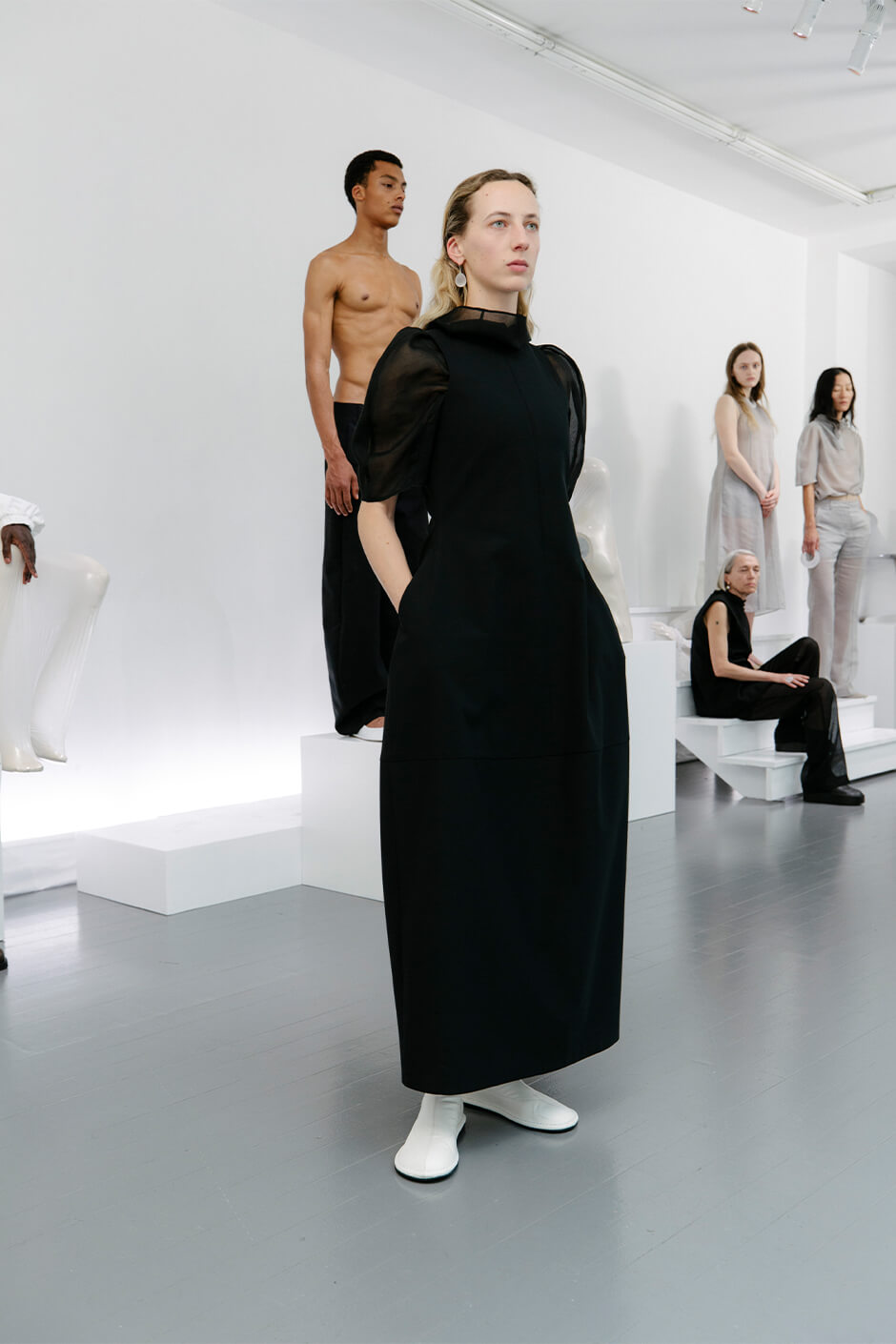 アート作品を包み込むさまざまな手法からインスパイアされ、ストレートラインのテーラリングに焦点を当てた独自のシルエットや、オーガンジー、ナイロンなどのシアー素材が登場した。