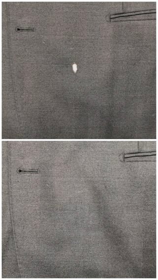 ジャケットの焦げ穴のビフォー(上)とアフター(下)
