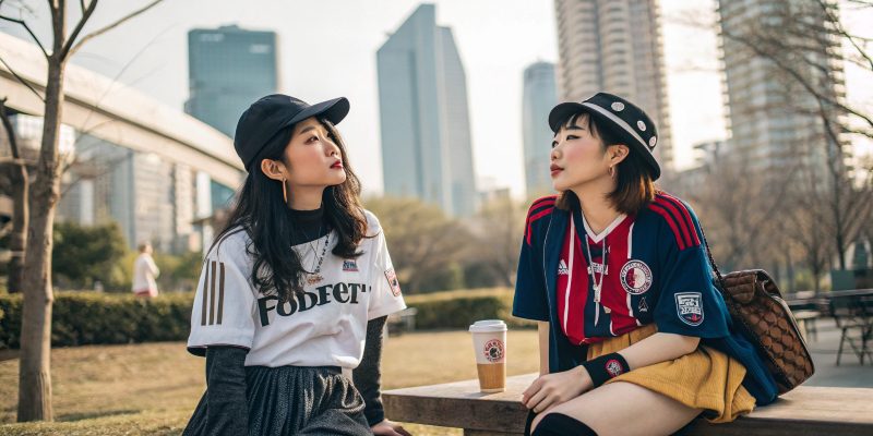 ブロークコアは、サッカーやラグビーなどのスポーツユニフォームを普段着に取り入れるのが特徴です。オーバーサイズのジャージや、チームロゴ入りのTシャツなどを、あえてカジュアルに着崩すスタイル。足元はスニーカーやトラックソールブーツなどを合わせ、全体的にボーイッシュな雰囲気を演出します。