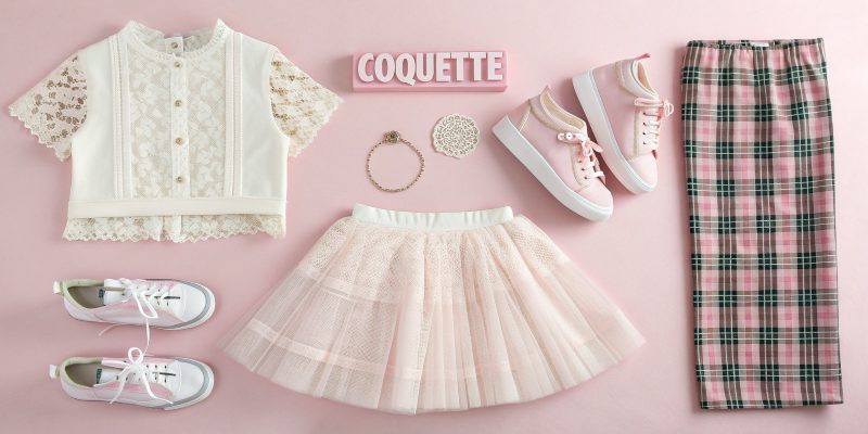 コケットコアは、フリルやレース、リボン、パステルカラーなど、ロマンティックな要素をふんだんに取り入れた一方で、大人っぽい色っぽさも取り入れたスタイルです。ミニスカートやワンピース、ブラウスなどを合わせ、可愛らしさを最大限に引き出します。足元はバレエシューズやメリージェーンなどを合わせることが多く、全体的に甘く、ドリーミーな雰囲気に仕上がります。