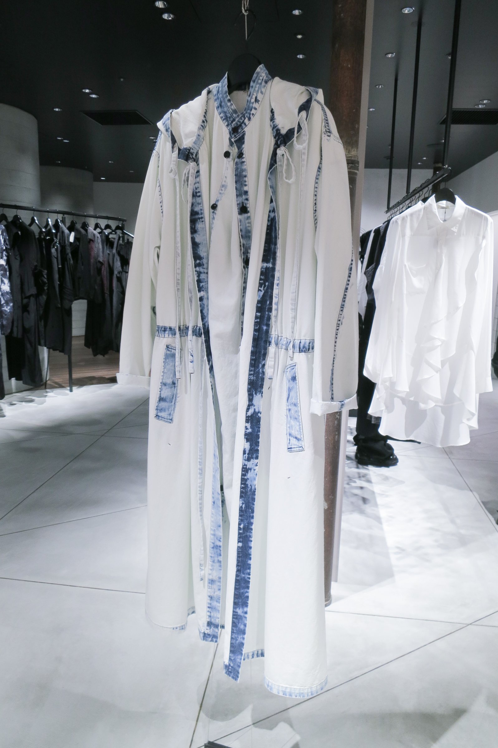 同店限定コレクションでは、渋谷パルコが掲げる「Under(De)Construction」とブランドの「壊して、新たなものをつくる」プロセスが呼応した、青を起点としたアイテムを製作。限界まで白く脱色させたインディゴブルーのデニムコート(16万5000円)やデニムドレス(12万1000円)をはじめ、同ブランドで人気のクレープデシン素材を用いたグレーのブルゾン(9万4600円)、青いステッチをあしらった綿麻素材のパンツとスカート(5万5000円)、「PARCO」を解体したオリジナルグラフィックをプリントしたTシャツ(1万2100円)やトートバッグ(7700円)などをラインナップしている。