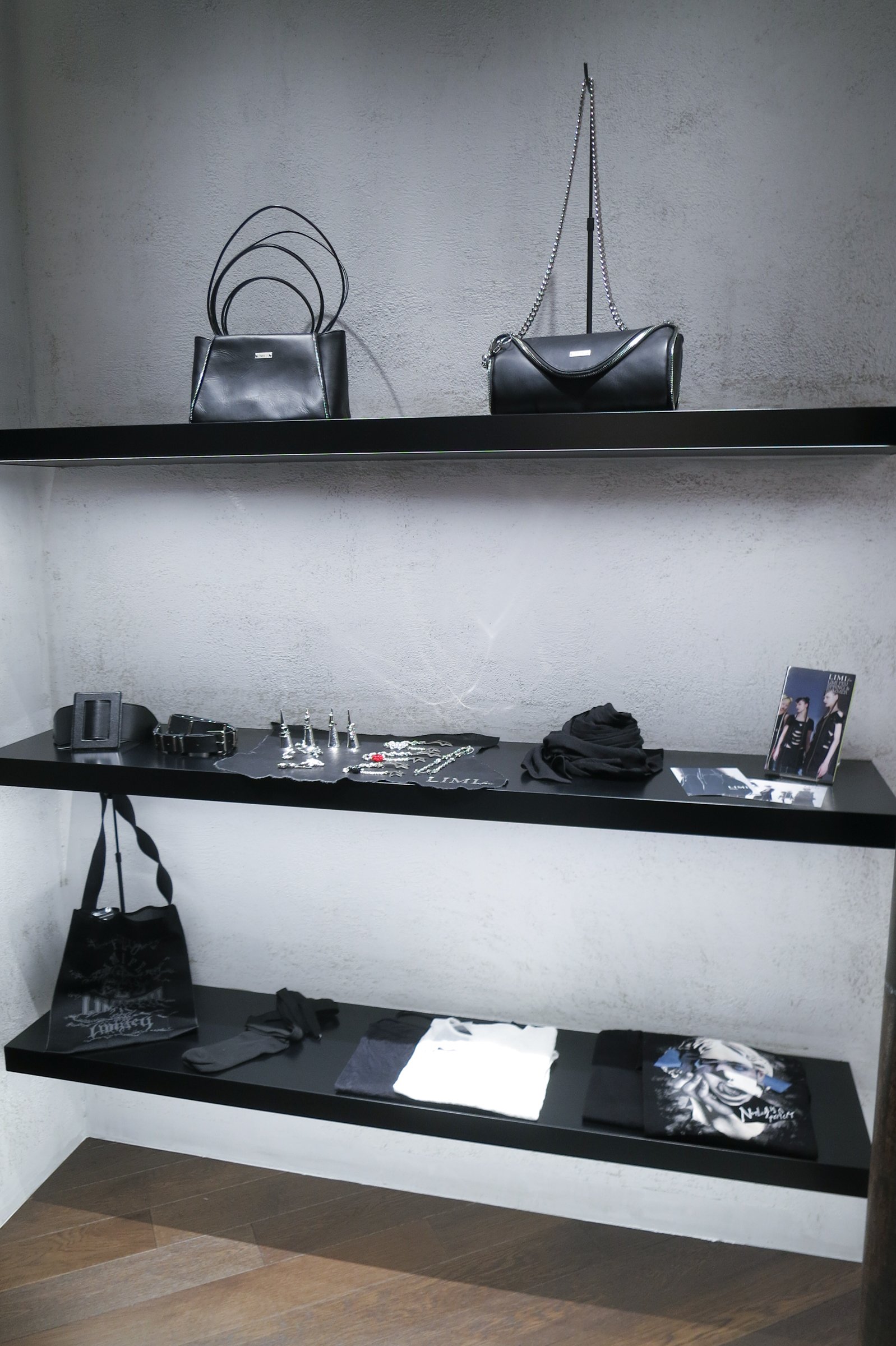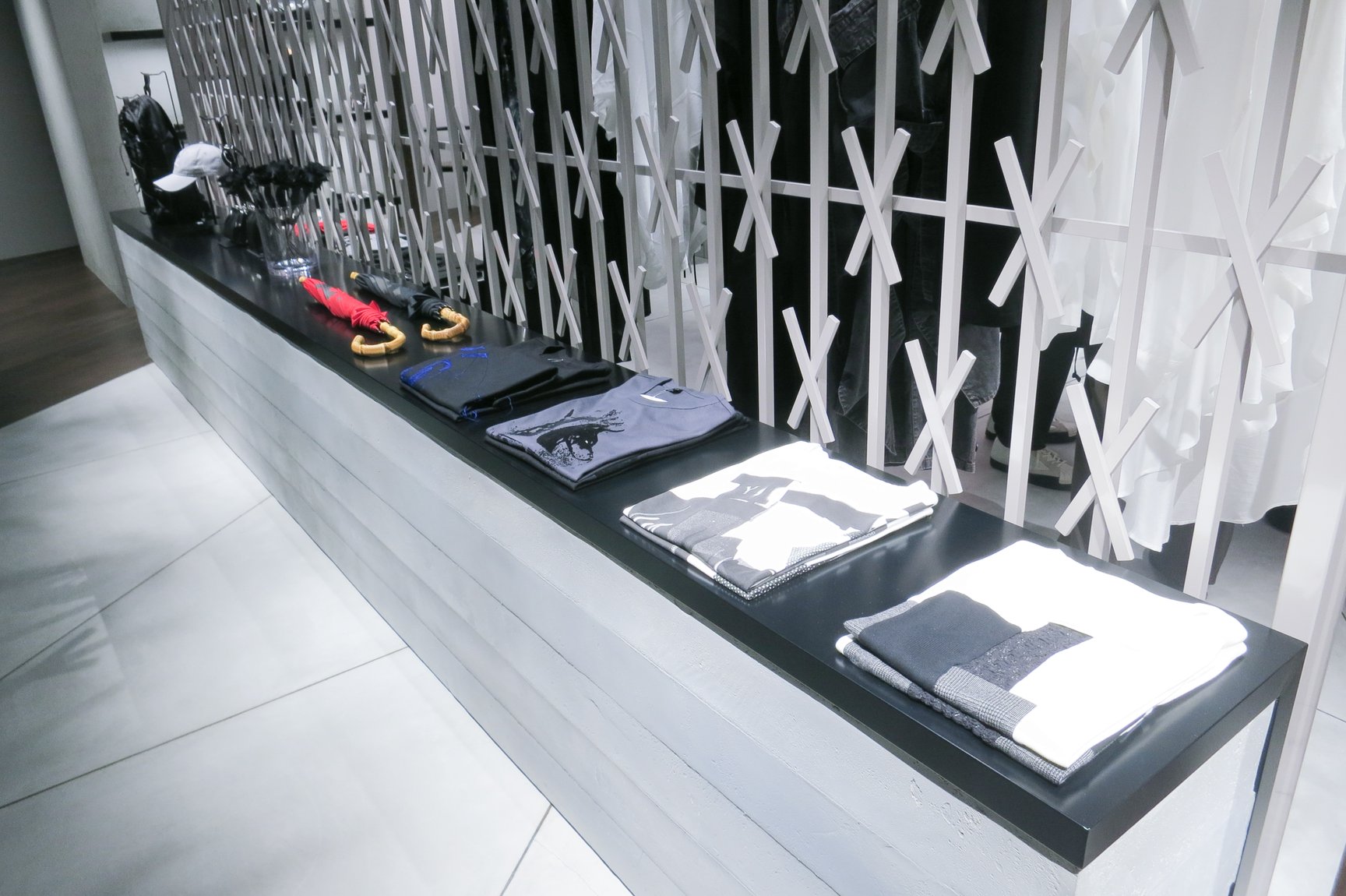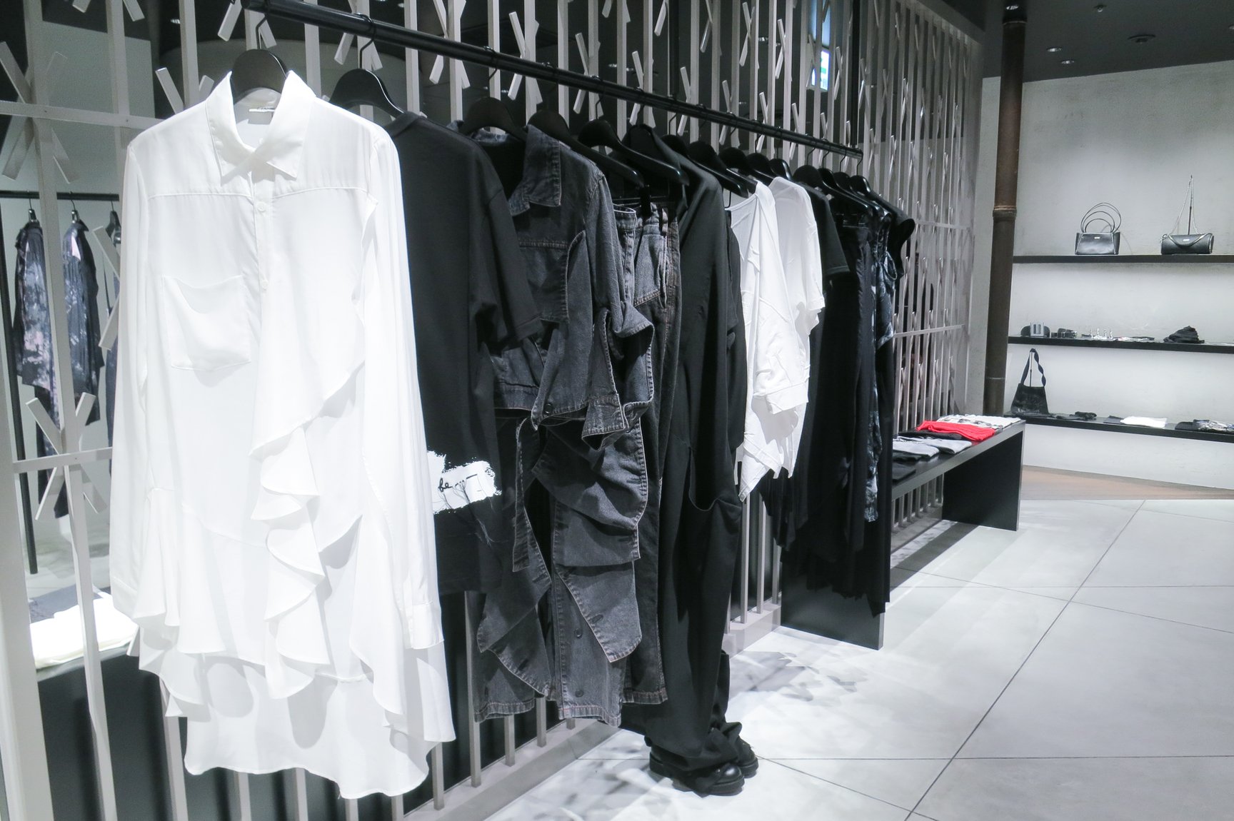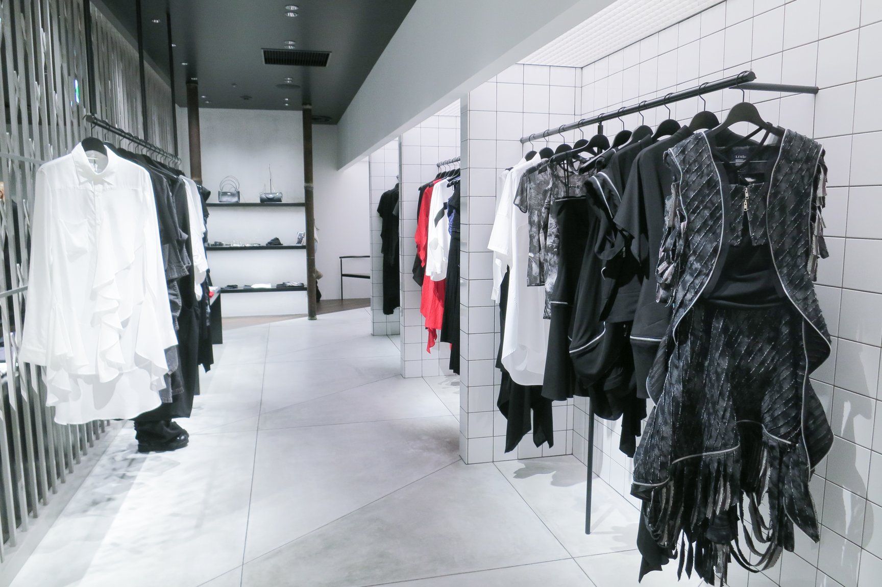 ワイズ / ワイズフォーメン / リミ フゥ 渋谷パルコ店は、「R.mond inc.」を主宰するセットデザイナー兼アーティストのENZOが店舗デザインを担当。「直線の中の大きな斜線」をテーマに、店内の左半分が黒やグレーを基調としたワイズとワイズフォーメン、右半分が白のタイルを基調としたリミ フゥのエリアとして構成しており、それぞれのブランドの個性と世界観を際立たせるソリッドで無機質な印象の空間が広がっている。
