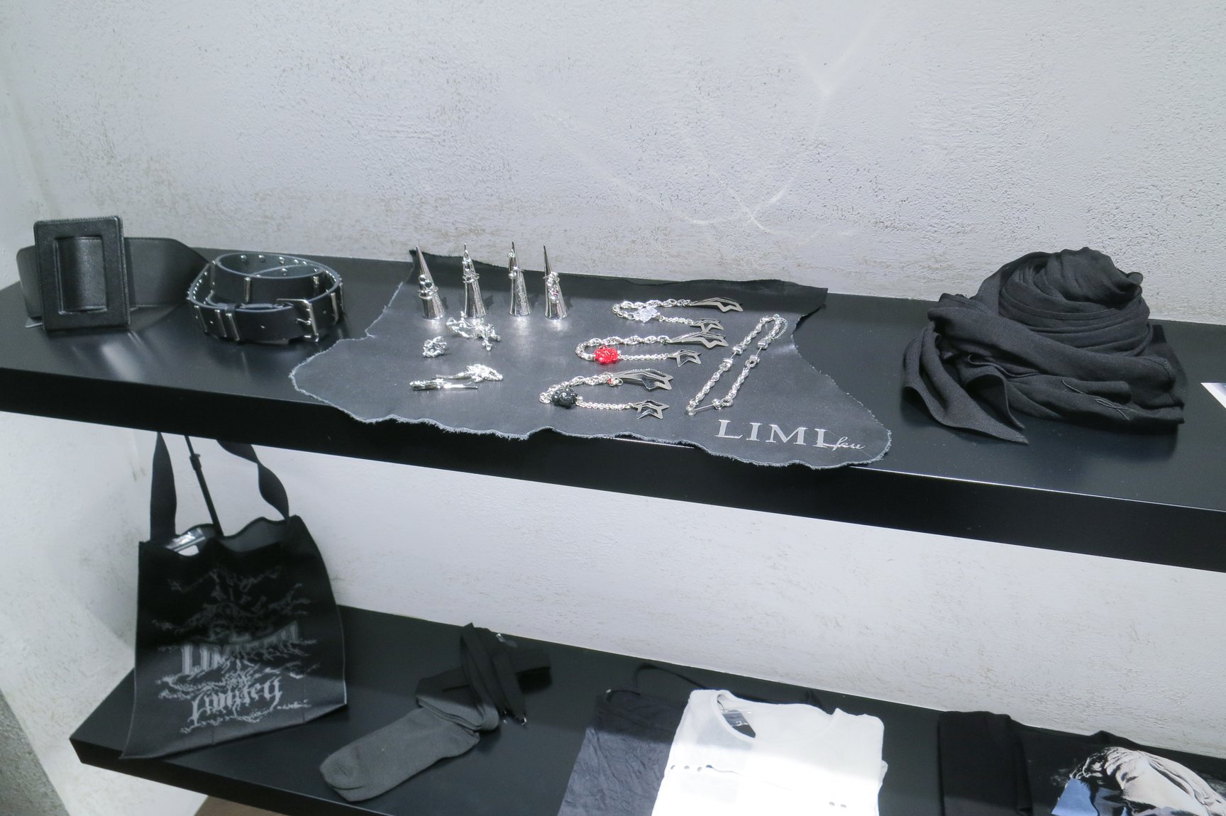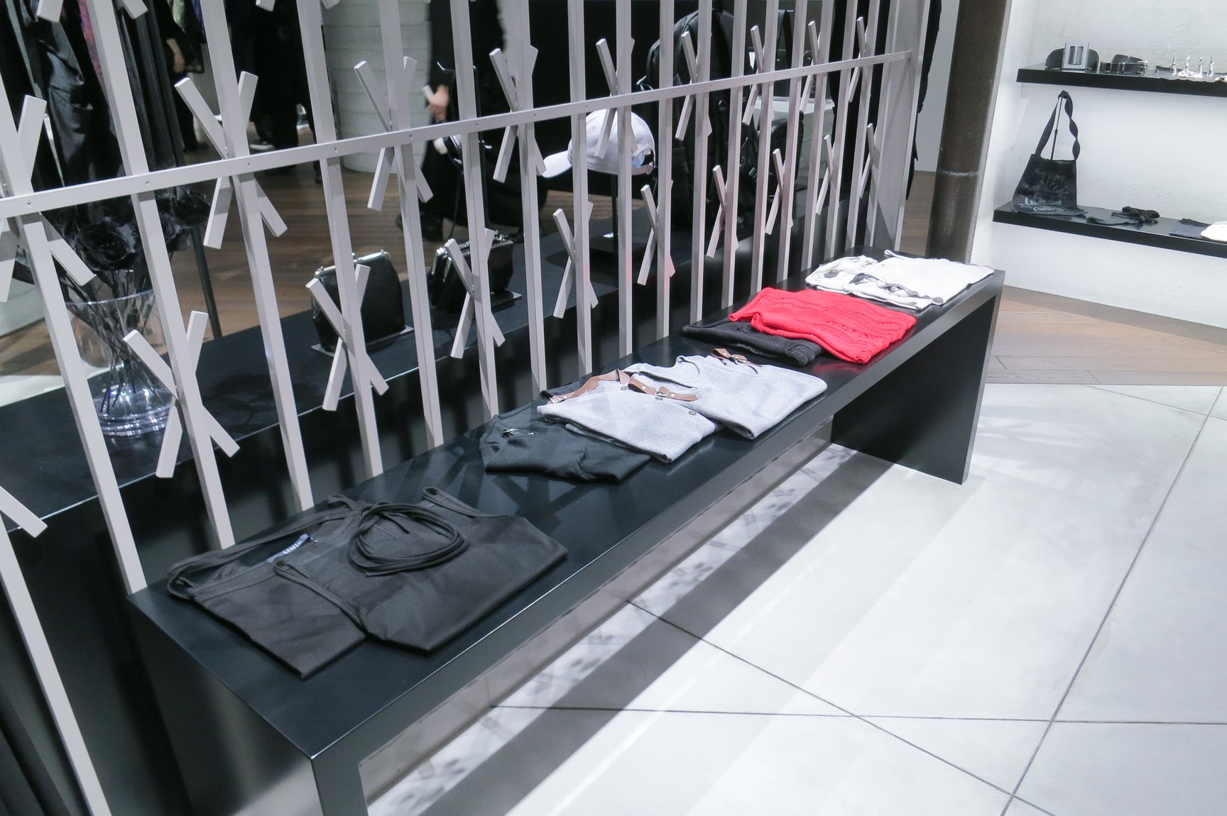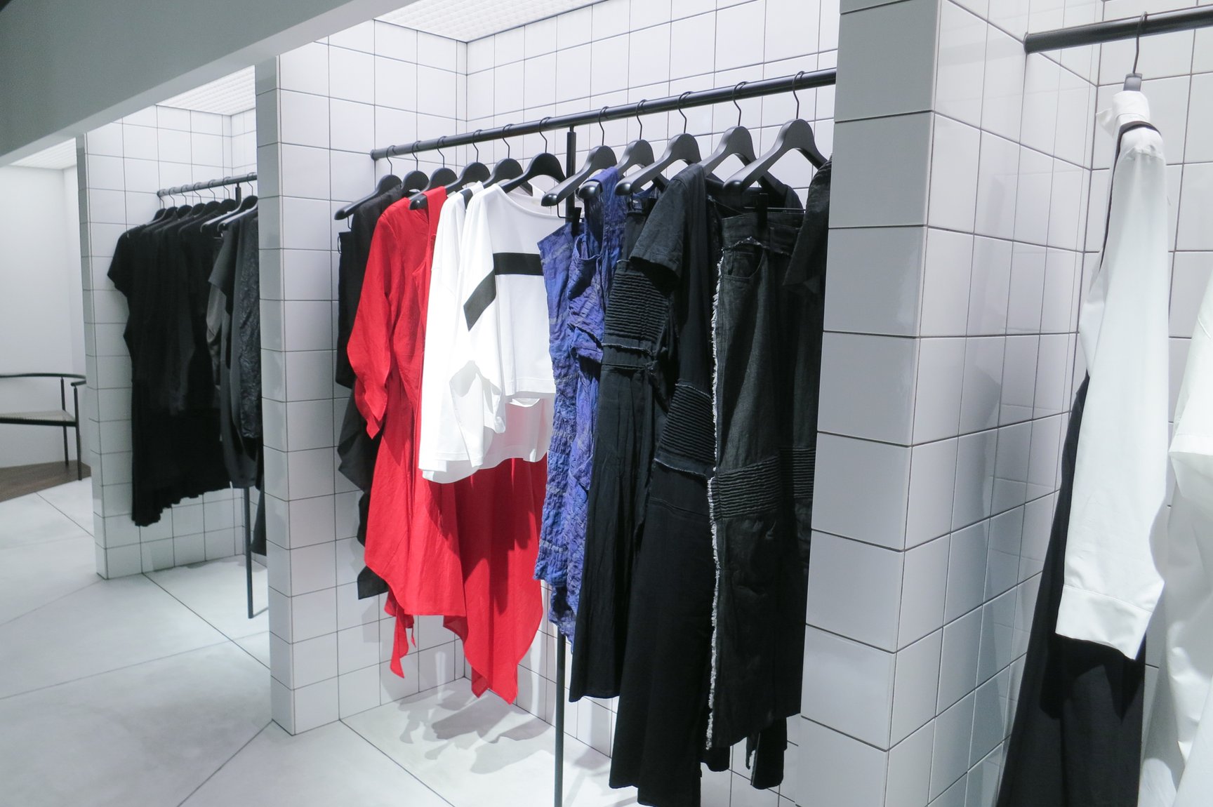 リミ フゥのエリアでは、白タイルを基調とした無機質な空間に、モノトーンと赤・青で構成された2025年春夏コレクションのウェアやバッグ、ジュエリーなどを豊富に展開している。
