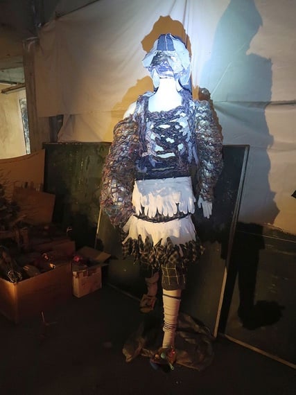 幼少期に親の離婚を経験したコバヤシダイスケさんは、消えてしまいそうな家族の記憶をとどめたい気持ちを服作りに託した。キャラクターの人形など、思い出を閉じ込めたビニール風船をつなぎ、構築的に見せたドレス、毛糸とプラバンのテープを立体的に編んだニットウェアなど、家族への様々な思いが絡み合った力強い作品を見せた。