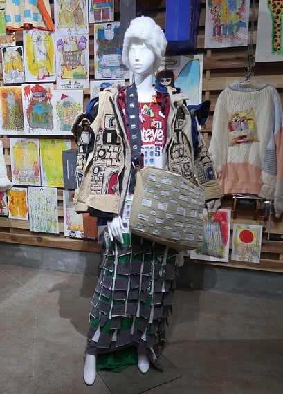 四角形に着目して様々なアイテムを縫い合わせて服作りしている斉藤幸樹さん。パターンを引くことは出来なくても、自分なりに造形する手法を見出す