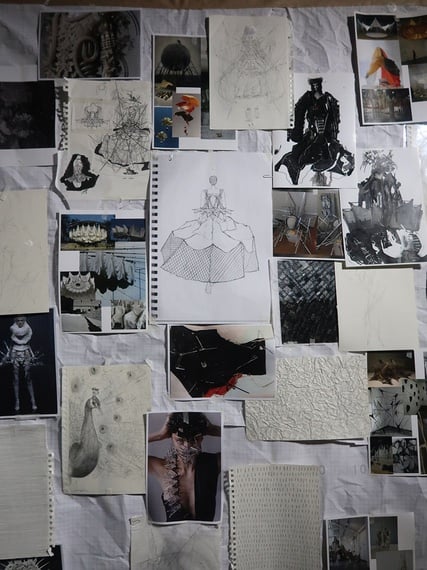 木村さんは絵具のテキスタイルをもとに、構築的なドレスの制作をめざす