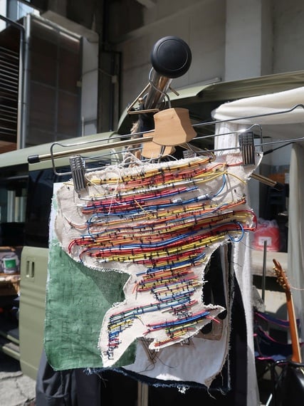 一例を上げると、solahamadaさんは、網走までのヒッチハイクで見つけた漁師のグローブに手刺繍したり、カラフルな配線管を刺繍で縫い留めたりした作品をワゴン車の扉を開けて展示した。「旅をして詩を書くように、思うがままに刺繍をする」ことで自分らしさを見いだす。