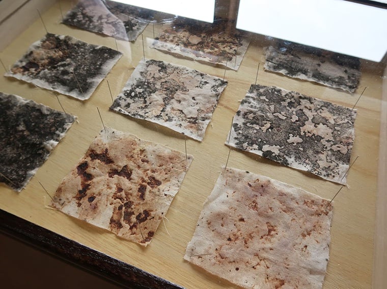 子供の頃から、自然界の成長、腐敗、発酵といった変化に興味があり、果物を組み合わせた「カビ染」の作品を作った窪アニカさん