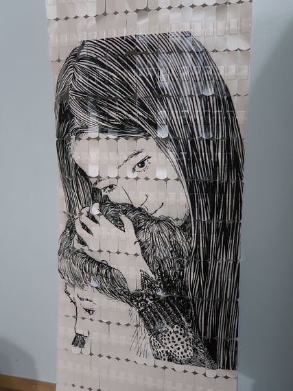 ばんそうこうを敷きつめたテキスタイルに自作の漫画の1シーンを描いた馬場逸平さん