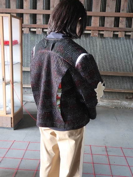 服作りに向き合った作品にも、異分野の視点が反映されている。別府星士朗さんは昨年に続き、幾何学的なアプローチで取り組んだ。着眼点はグリッド。生活に欠かせないディスプレーの座標を現代の表層と捉え、赤いトラック柄を下地に手作業でコードをグリッドのように縫い合わせてパターンを作り、ブルゾンを作った。体に沿った曲線が立体感を生み、角度によって柄の見え方が変わる。
