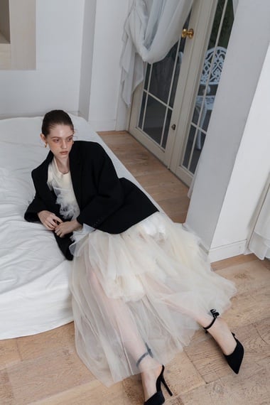 チュールドレスとテーラードジャケットを合わせたスタイリング